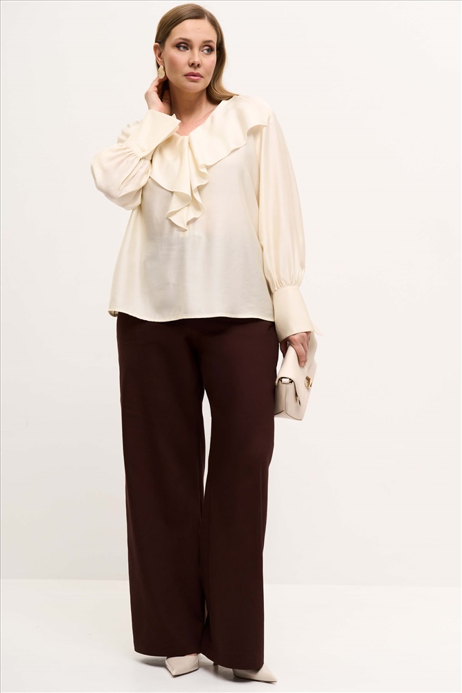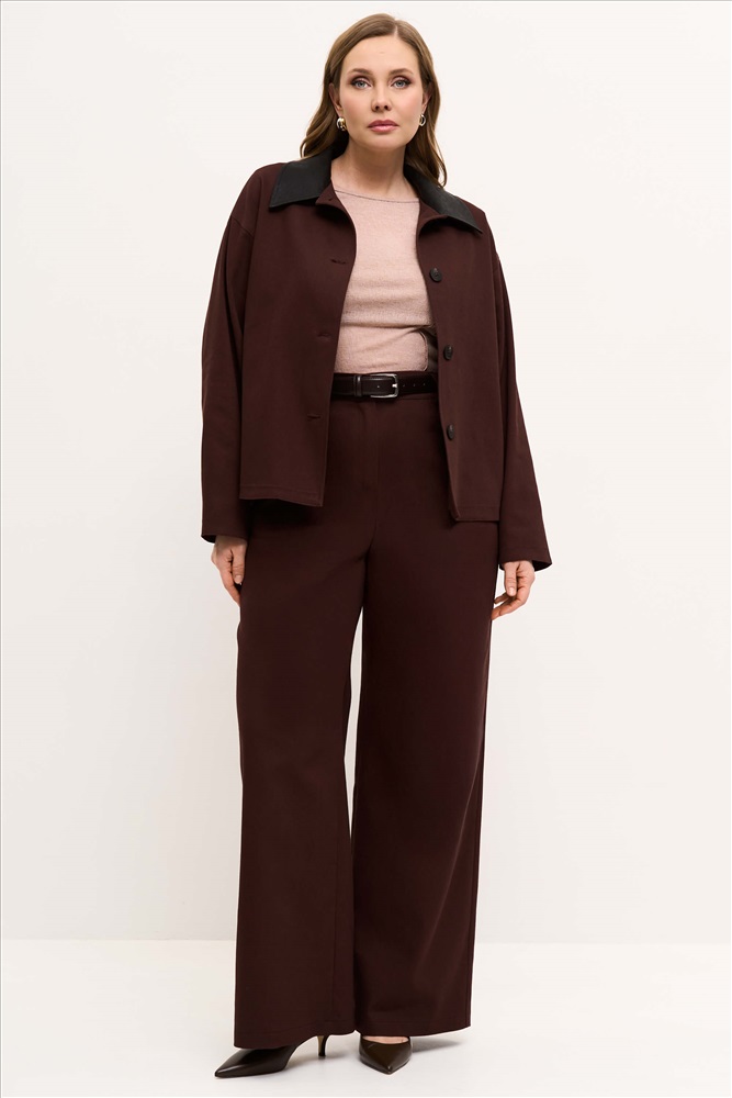 Состав: 95% хлопок 5% эластан Длина: 110 см. Цветовая гамма: Шоколад Силуэт: Прямой Принт: Нет Коллекция: Большие размеры Весна #1 Широкие брюки из эластичного джинсового полотна. По спинке резинка, кокетка, накладные карманы. Комментарии к товару