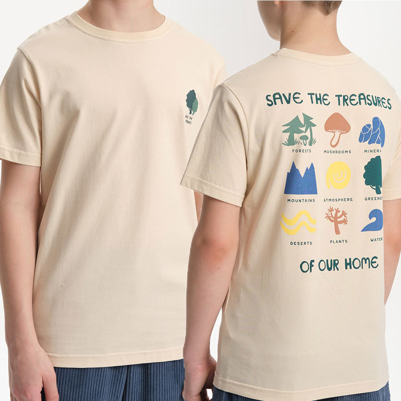 Состав: 100%хлопокОписание: Футболка для мальчика свободного кроя - это идеальный выбор для активного ребенка. Вырез горловины обработан эластичной тканью — она прекрасно держит форму, не растягивается, при этом ребёнку удобно надевать и снимать футболку. Футболка летняя с принтом на спине и надписями. Выполнена из 100% высококачественного хлопка. Перевод надписей "save the treasures of our home" - сохрани сокровища нашего дома, "forests, mushrooms, minerals, mountains, atmoshpere, greenery, deserts, plants, water" - леса, грибы, минералы, атмосфера, зелень, пустыни, растения, воду. Спортивная футболка подходит как для подростков так и для малышей в детский сад. Подходит для любого времени года.