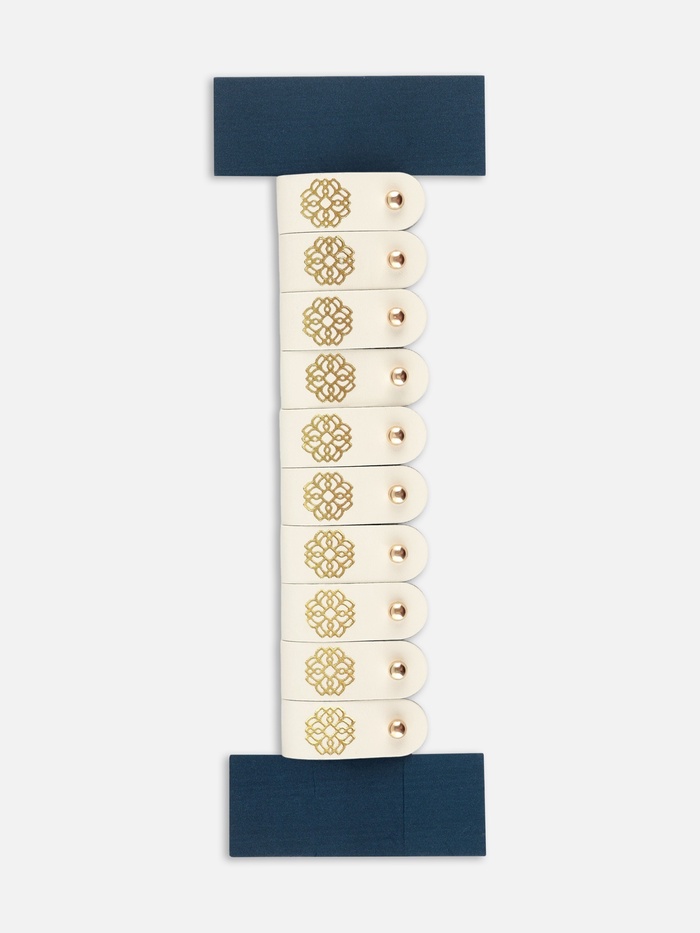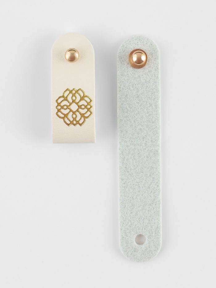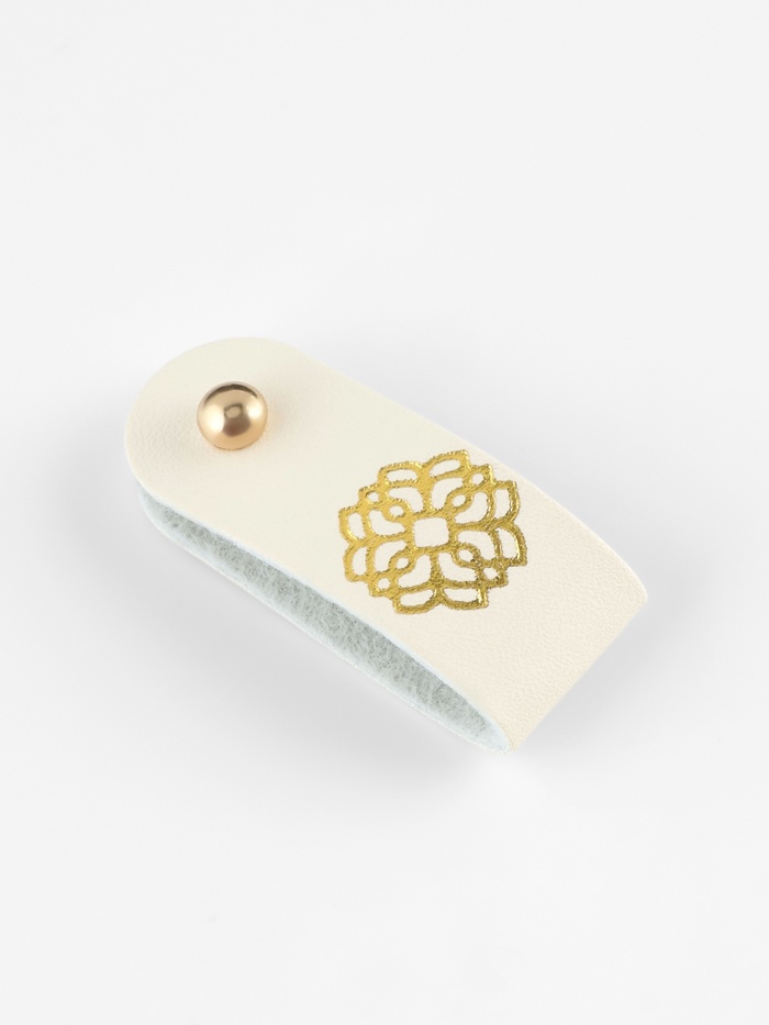 Эксклюзивный декор для ваших изделий — бирки с кнопкой «Мандала» из молочно-белой искусственной кожи с золотым тиснением создают эффект роскошной отделки. Узор в виде священного символа добавляет глубину и смысл рукодельным работам.