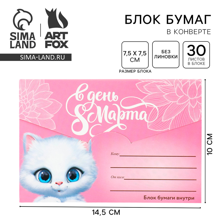 Производитель: ArtFox; Габариты: 14,5 x 10 x 0,5; Страна: Россия; В боксе: 505 шт; Состав: Бумага; Материалы: бумага; Фасовка: по 1 шт; Индивидуальная упаковка: Полиэтиленовая пленка; Сертификат: Не подлежит сертификации; Набор: Нет; Цвет: Розовый; Для кого: Для девочки; Формат: Квадрат; Плотность, г/м²: 65; Тип скрепления: На отрывной склейке; Размер, см: 7.5 х 7.5; Европодвес: Нет; Количество листов: 30; Тематика: Женская; Тематика праздника: 8 Марта; Адресат: Без адресата; Возраст: Детский; Материал: Бумага; Особенности: Дизайнерский блок; Размер, мм: 75 х 75; Штрихкод на единице товара: Да; Цвет листов: Цветной