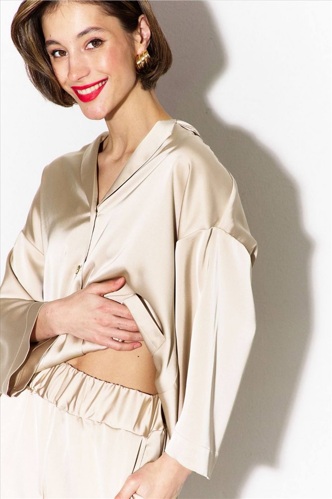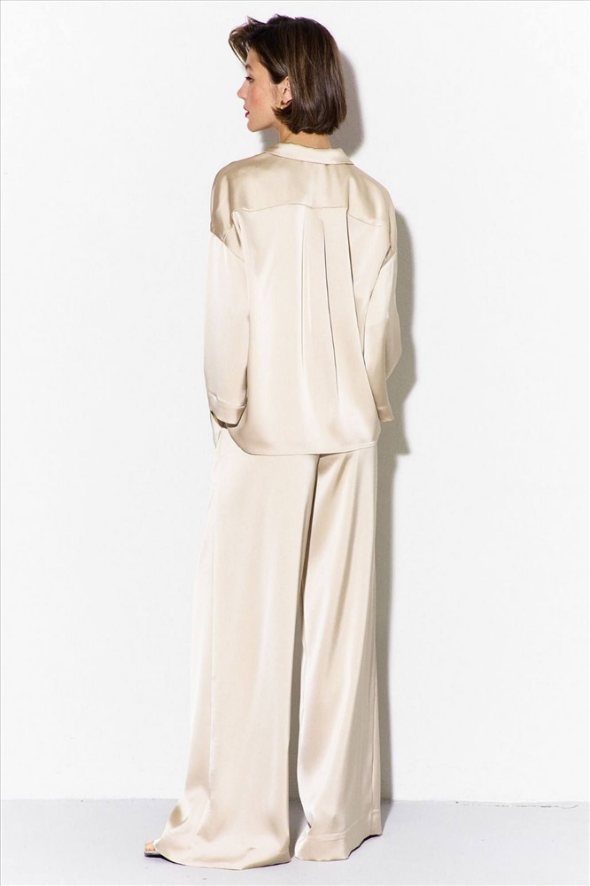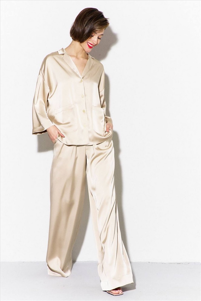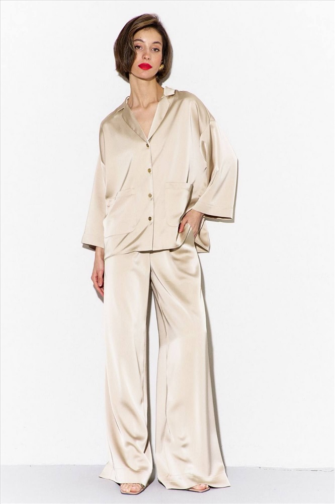 Комплект (блузка и брюки): -блуза свободного кроя со спущенной линией плеча -по переду настрочены накладные карманы -рукава одношовные, втачные, длиной 3/4 -воротник пиджачного типа -брюки палаццо на притачном поясе с резинкой -в боковых швах карманы.