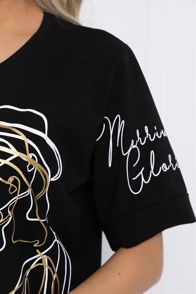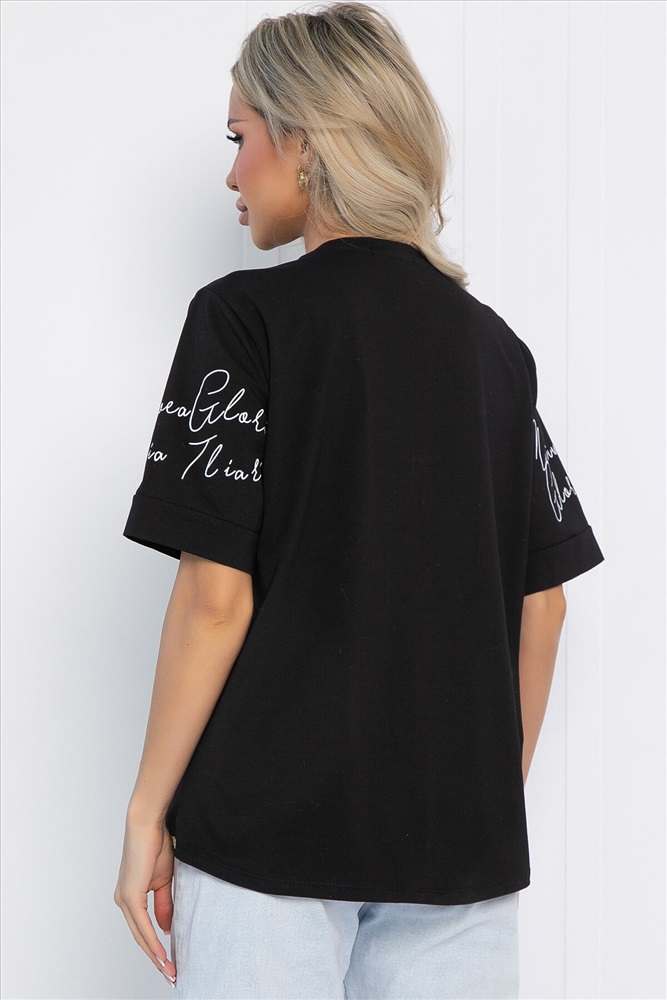Тип ткани: натуральная. Состав: 95% хлопок, 5% спандекс. Материал: хлопок. Цвет: черный. Принт: рисунок. Вид застежки: без застёжки. Карманы: отсутствуют. Силуэт: полуприлегающий. Подкладка: отсутствует. Декоративные элементы: стразы. Длина по переду (ассиметричный крой): 46/ 59 см, 48/ 62 см, 50/ 63 см, 52/ 65 см, 54/ 67 см. Длина по спинке от верхней точки плеча: 46/ 62 см, 48/ 65 см, 50/ 67 см, 52/ 69 см, 54/ 71 см. Размер изделия на модели: 44 Рост модели: 168 см. Чёрная блузка — это прекрасное дополнение к вашему гардеробу, которое поможет создать стильный и модный образ. Она выполнена из натуральной ткани, что обеспечивает комфорт и удобство в носке. Блузка украшена уникальным абстрактным рисунком и стразами, которые придают ей изюминку. Декоративная резинка на передней части подчеркивает фигуру и создает эффектный силуэт. Уход за изделием: ручная стирка до 30 градусов; нельзя отбеливать; отжим запрещён; гладить при t не более 110 С; гладить с изнанки. Внимание! Рекомендуем ориентироваться на размерную сетку и выбирать свой привычный размер, согласно размерной таблице. *Допуск отклонения длины при массовом производстве 1-3 см является нормой. Комментарии к товару