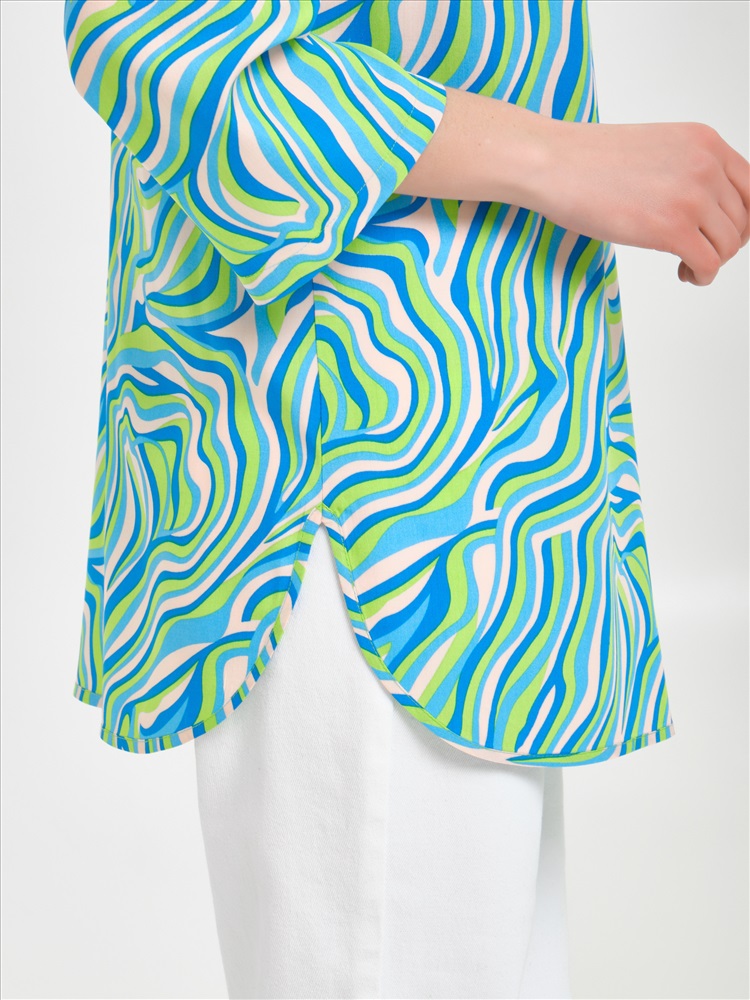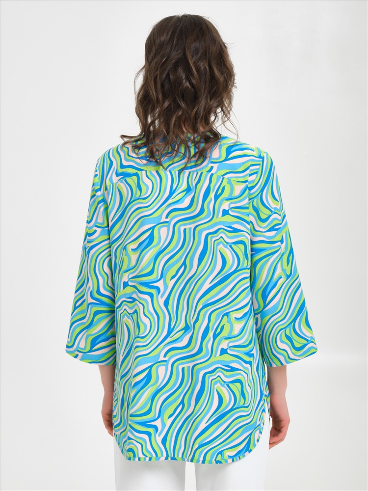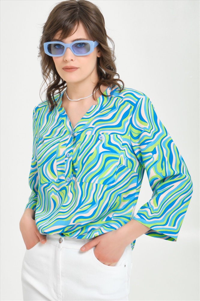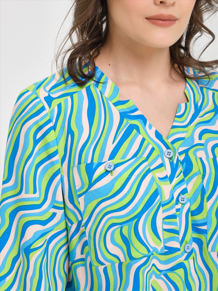 Блуза голубого цвета с рукавом 3/4 от фабрики Priz. Модель прямого силуэта, выполнена из текстильного полотна. Вырез горловины V-образный, подчёркнут фигурной планкой. Спереди накладные карманы с застежкой на петлю и пуговицу. Спинка с отрезной кокеткой, переходящей на перед. Низ блузки фигурный, обработан окантовкой. Комфорт и стиль на каждый день., Оттенок цвета и расположение рисунка могут незначительно отличаться от фото., Ожидание отправки (рабочих дней): 7, Размер модели: 44., Рост модели: 174 см., Состав:, Вискоза 100%, Тип ткани:, Вискоза