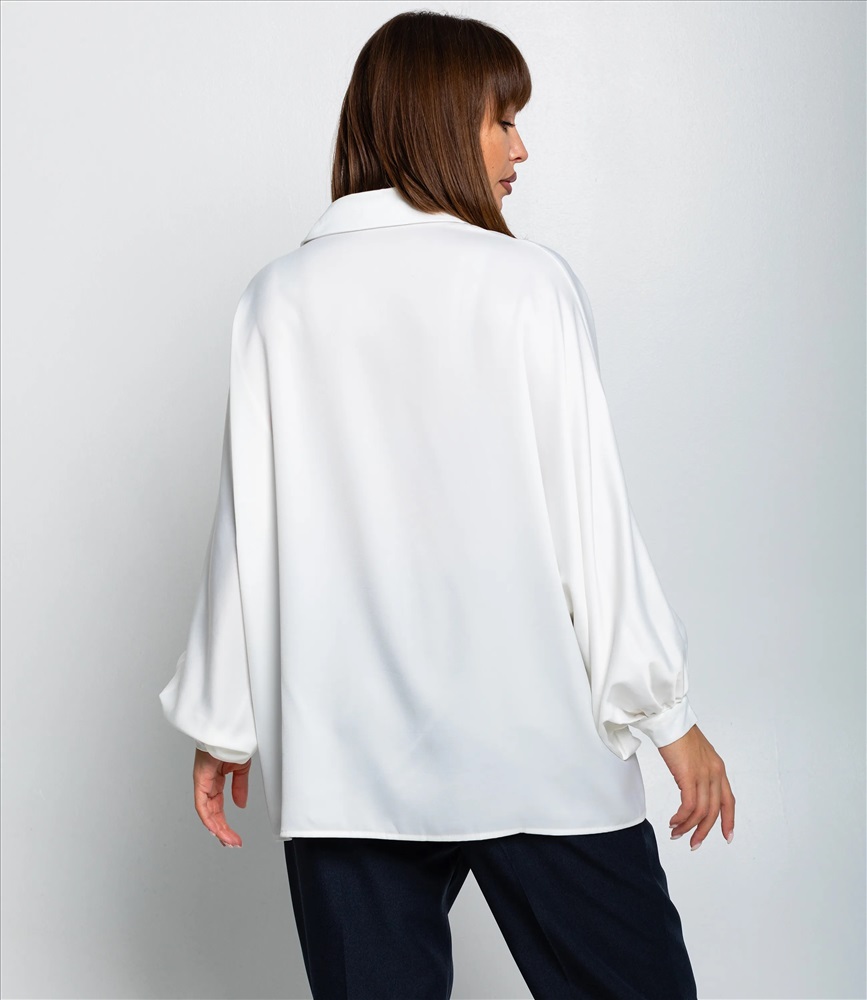Блуза — это незаменимый элемент гардероба, который подчеркнет индивидуальность и стиль каждой женщины. Эта прекрасная модель, выполненная из 95% полиэстера и 5% эластана, отличается легкостью, создавая воздушный и нежный образ. Блуза изготовлена из струящейся гладкой ткани с легким блеском, имеет свободный силуэт с прямым кроем, который мягко ниспадает от плеч. Воротник рубашечного типа с классическими лацканами и V‑образным вырезом при расстёгнутой верхней пуговице. Передняя планка с рядовой застёжкой на пуговицы, пуговицы маленькие, аккуратные, пришиты в один ряд по всей длине. Рукава длинные, расширенные от плеча, с объёмной линией до запястья, где собраны в широкие манжеты на одну пуговицу, создавая лёгкие драпировки у локтя и запястья. Плечи слегка опущенные, швы минимально выражены, что усиливает эффект свободного прилегания. Низ блузы прямой, чуть удлинённый сзади и свободно падающий по бёдрам, с аккуратно обработанным подгибом. Швы и обработка горловины выполнены аккуратно, без декоративной отделки Установленная цена является приемлемой и выгодной для оптовых покупателей, что делает вашу коллекцию еще более привлекательной. Не упустите возможность предложить своим клиентам эту удивительную блузу, которая добавит в их гардероб стиль и элегантность. Подарите вашим покупателям возможность чувствовать себя уверенно и привлекательно в любой обстановке! Вы можете заказать онлайн презентацию на интересующие Вас модели. Наши менеджеры свяжутся с Вами и проведут индивидуальную видеотрансляцию, помогут составить заказ и ответят на Ваши вопросы.
