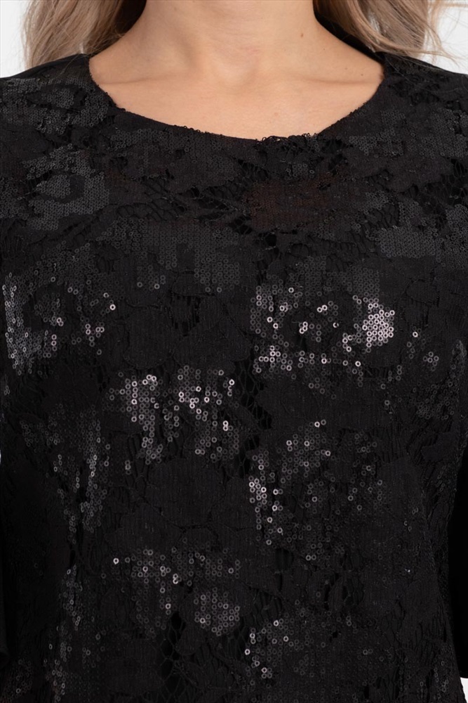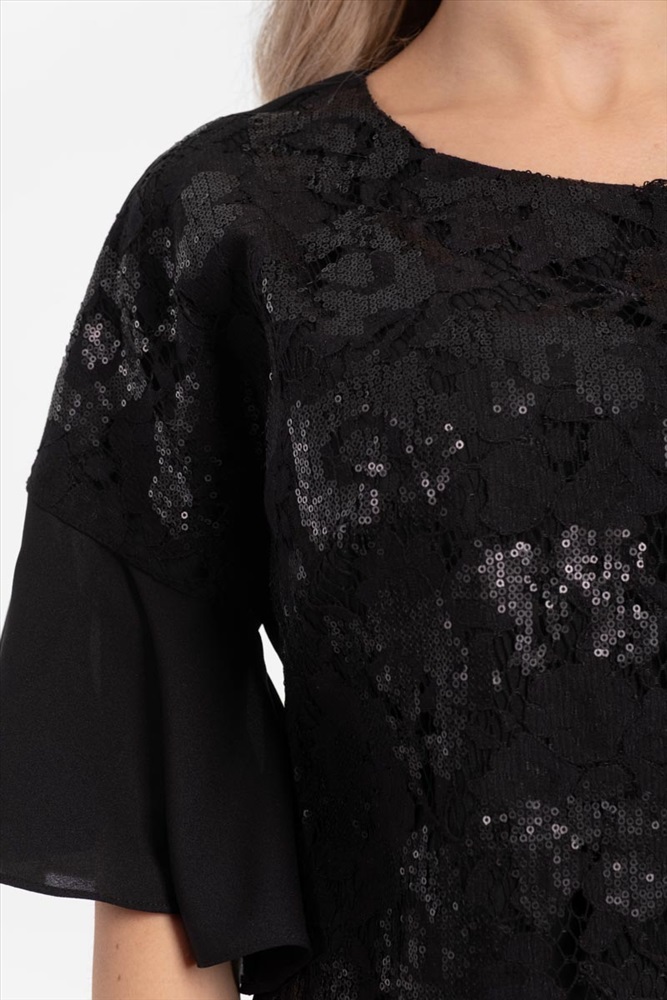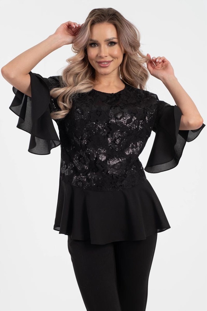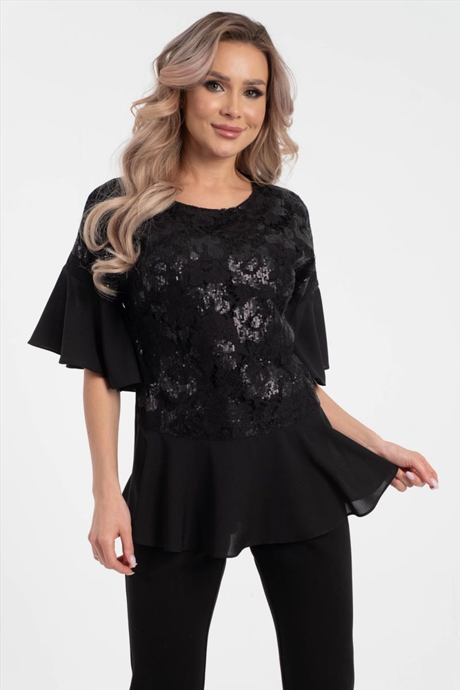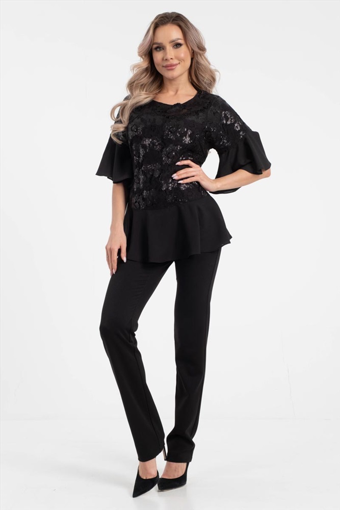 Очаровательная блузка свободного силуэта из текстильного полотна черного цвета. Круглый вырез изделия обработан внутренней обтачкой. Перед изделия двойной, кружево на текстильной основе. Низ изделия и втачные рукава дополнены вставками из легкого шифонового полотна.