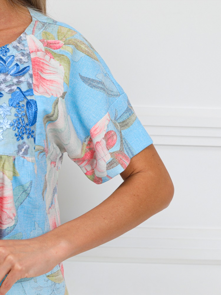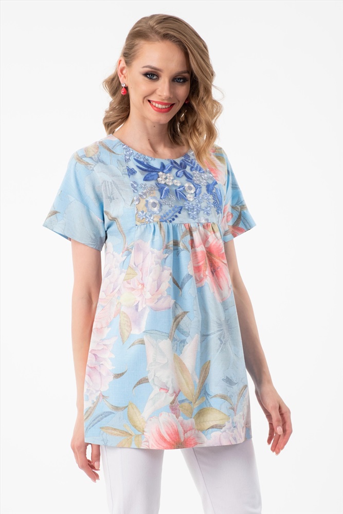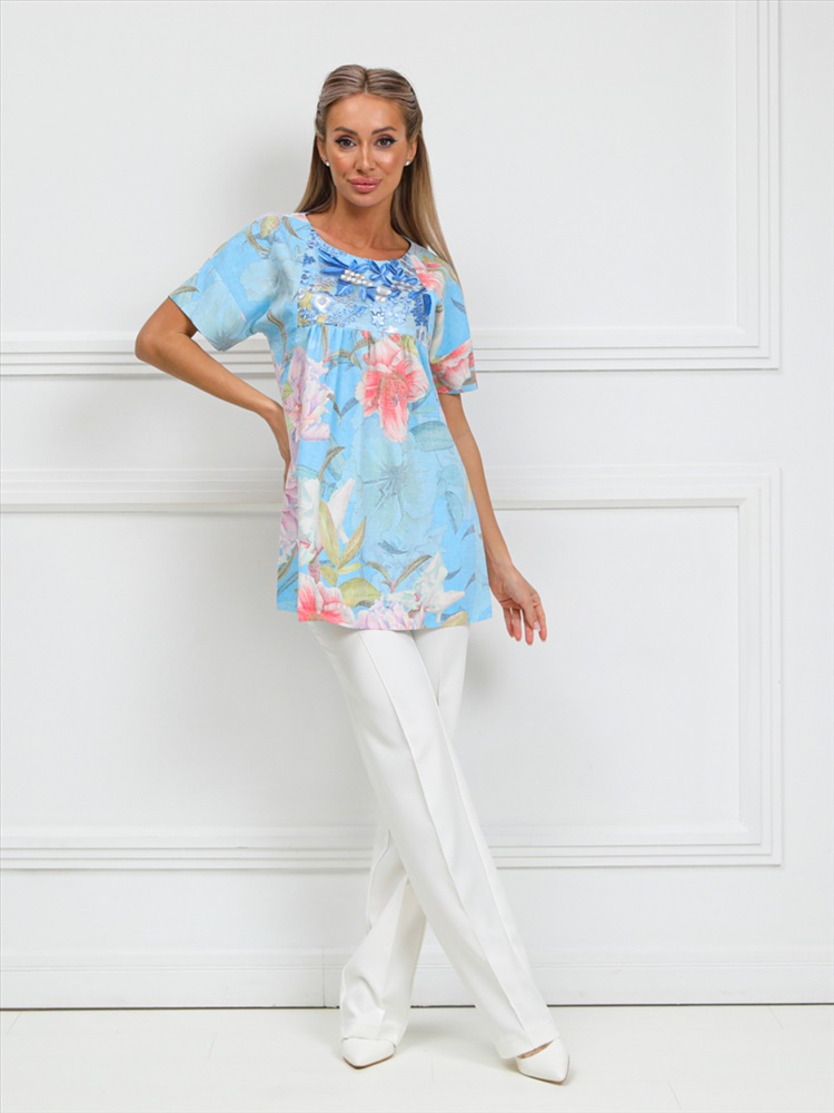 Обаятельная блузка полуприлегающего силуэта из текстильного полотна голубого цвета. Круглый вырез изделия обработан внутренней обтачкой. Блузка с отрезной кокеткой, дополненной кружевом. Линия груди эффектно подчеркнута небольшой сборкой. Блузка с цельнокроеными рукавами. Аксессуары в комплект не входят. Длина изделия по спинке от плечевого шва до низа изделия — 74 см. Рост фотомодели — 170 см.