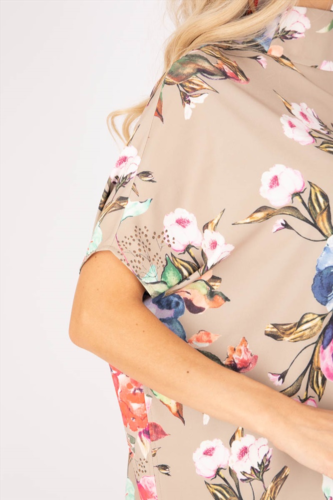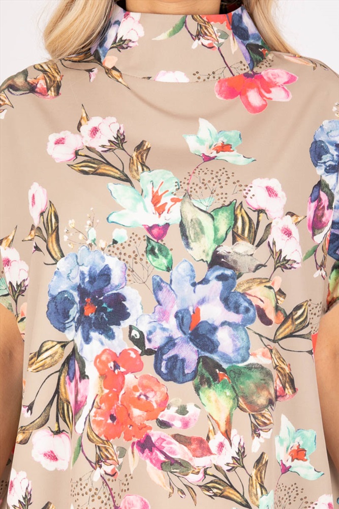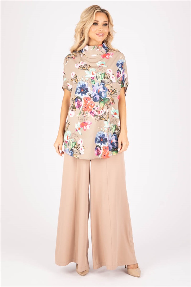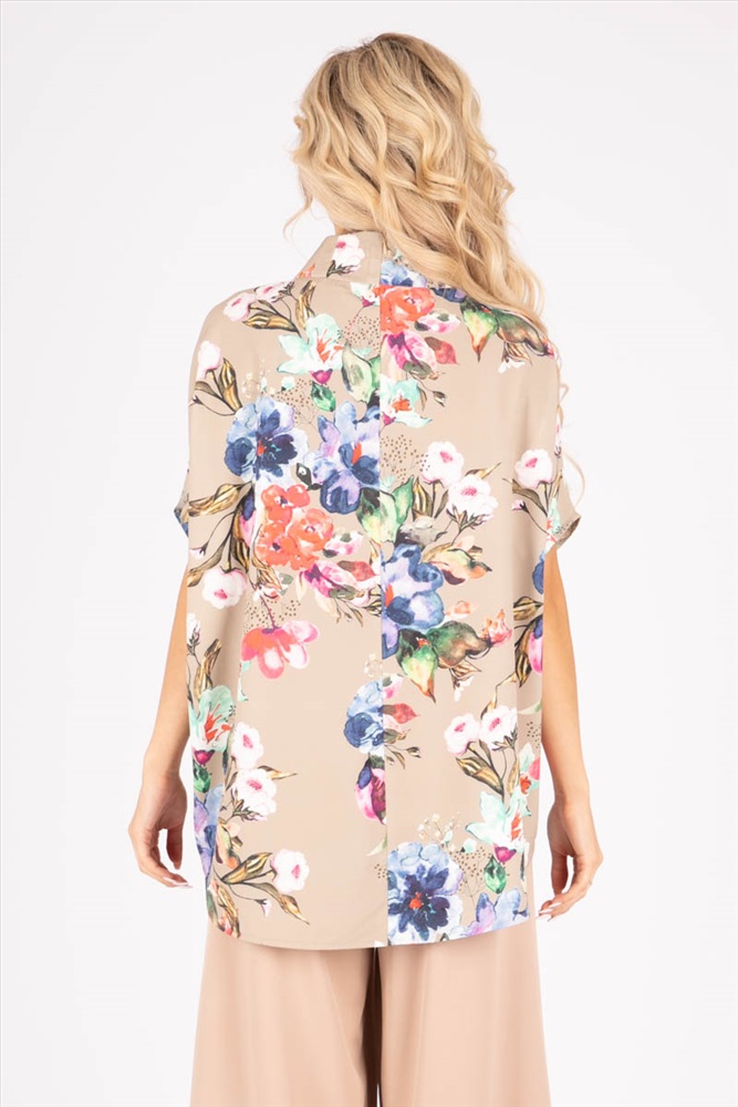 Элегантная блузка свободного силуэта из текстильного полотна бежевого цвета. Круглый вырез обработан воротником «полустойка». Блузка с цельнокроеными рукавами. Длина изделия по спинке от плечевого шва до низа изделия — 75 см. Рост фотомодели — 170 см.