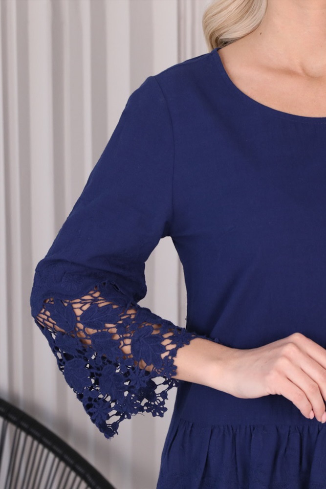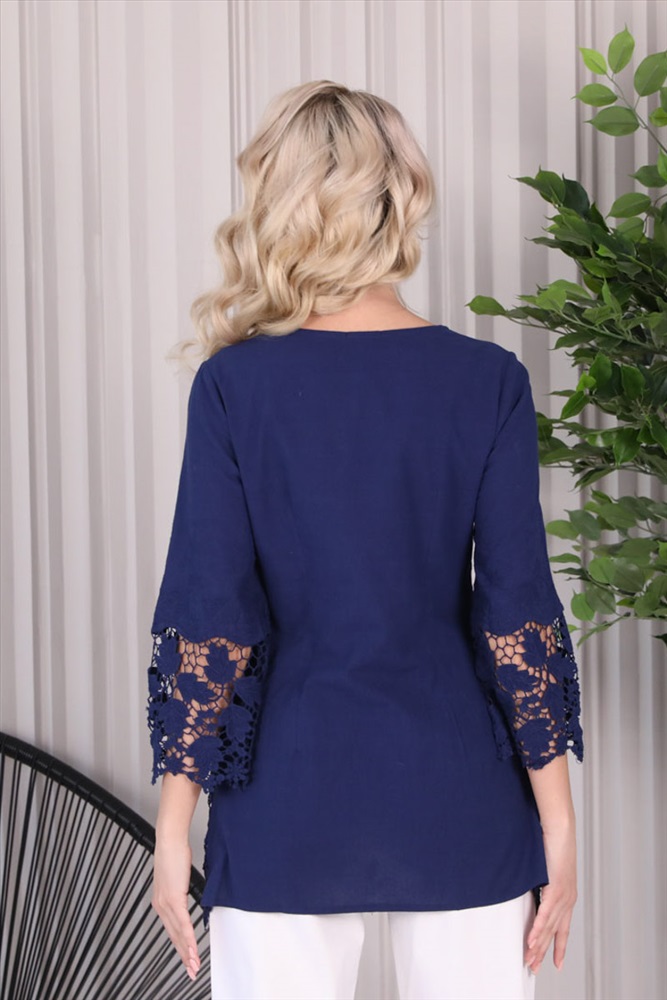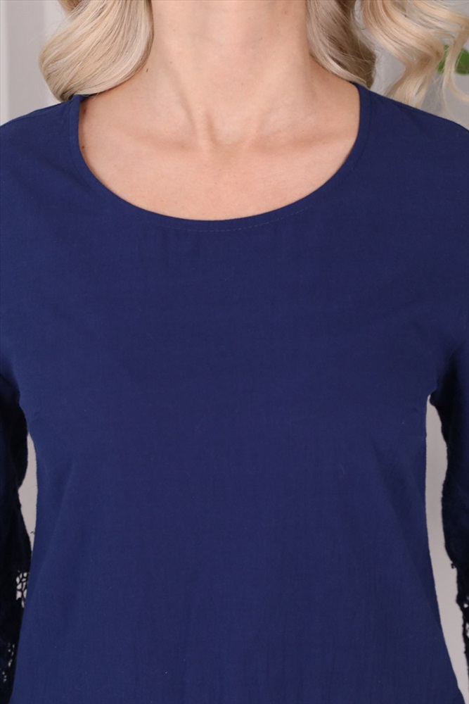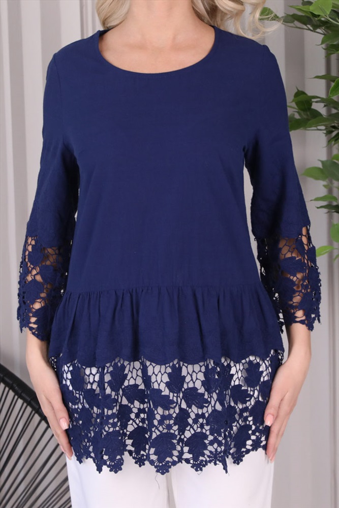ШтрихКод: 4630328703657 По размеру: 42, 44, 46 Состав: Хлопок 100% Скидка на сайте: 50% Срок готовности: 2018-04-08T00-00-00 Изысканная блузка свободного силуэта из текстильного полотна темно-синего цвета. Круглый вырез изделия обработан окантовкой. Втачные рукава украшены выбитым рисунком. По переду низа изделия волан с выбитым рисунком. Аксессуары в комплект не входят. Длина изделия по спинке от плечевого шва до низа изделия — 70 см. Комментарии к товару