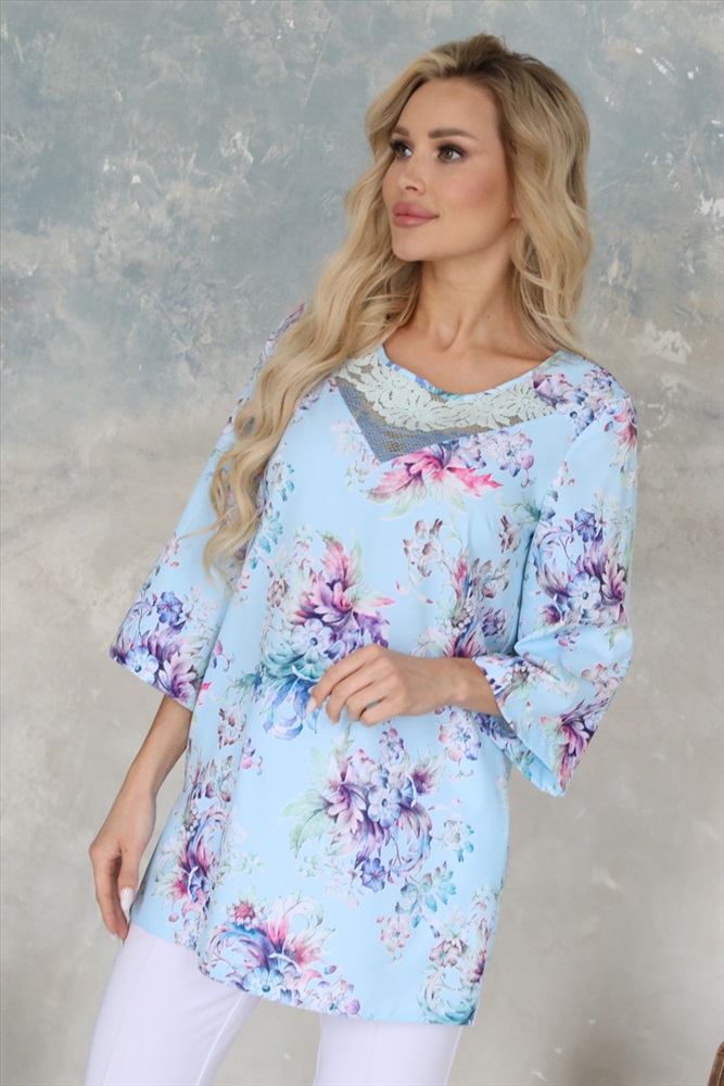 Милая блуза прямого силуэта из текстильного полотна бело-голубого цвета. Круглый вырез изделия обработан окантовкой и дополнен кружевной кокеткой. Блуза с втачными рукавами. В боковых швах изделия разрезы.