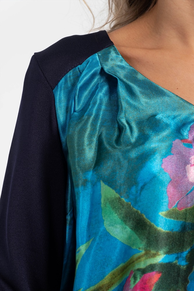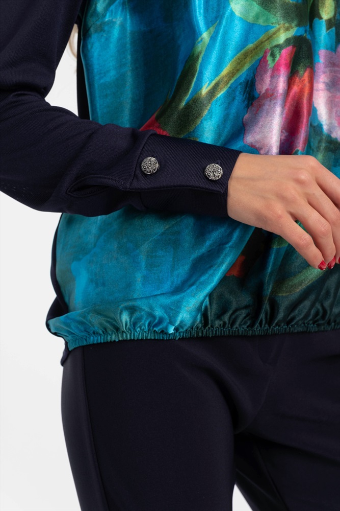 Приятный джемпер свободного силуэта из комбинированных трикотажного и текстильного полотен синего цвета. Фигурный вырез изделия обработан внутренней обтачкой. Низ втачных рукавов обработан широкими манжетами с застежкой на пуговицы. Перед изделия выполнен из атласа с цветочным принтом. По плечам изделия декоративные складки. Низ джемпера по переду дополнен кулиской на резинке.