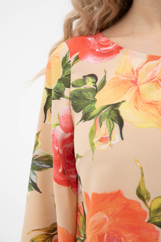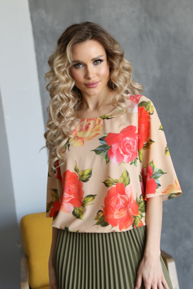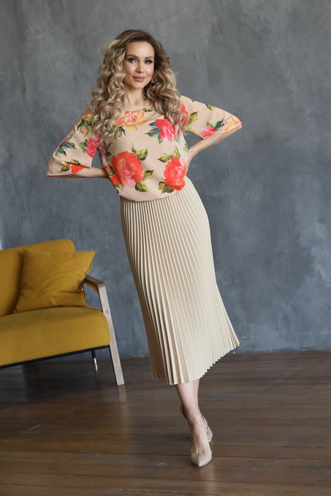 Очаровательная блуза прямого силуэта из текстильной ткани бежево-оранжевого цвета. Круглый вырез обработан окантовкой. Джемпер с цельнокроеными рукавами. По низу джемпера — манжет. Длина изделия по спинке от плечевого шва до низа изделия — 55 см.