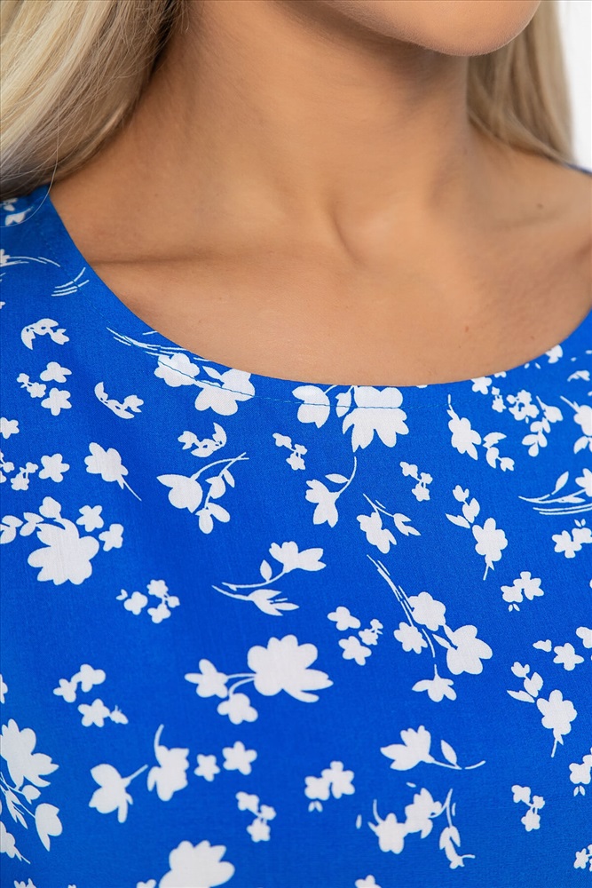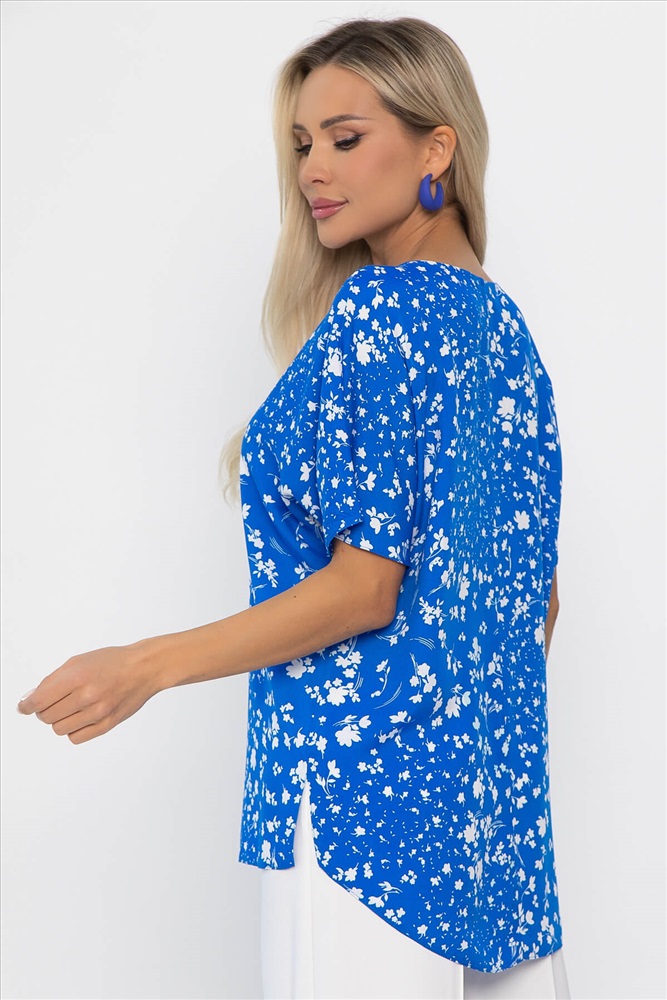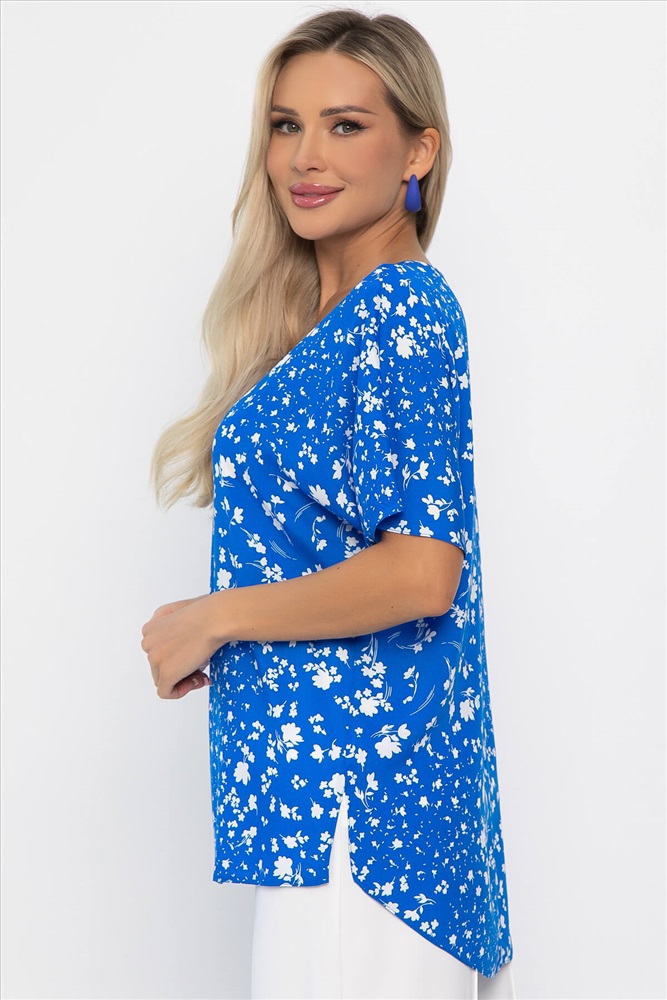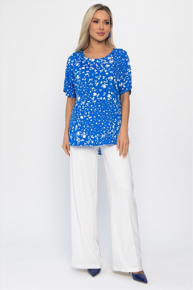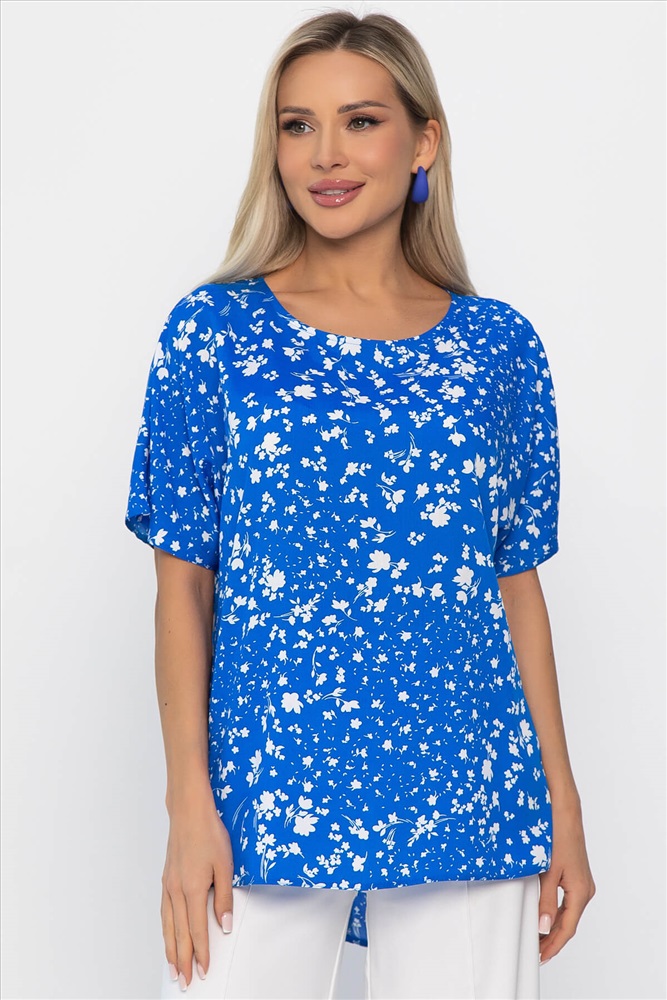 Материал : штапель Цвет : голубой Принт : цветы Силуэт : прямой Карманы : отсутствуют Подкладка : отсутствует Вид застежки : без застёжки Декоративные элементы : отсутствуют Длина : 44 - 70 см,, 46 - 71 см,, 48 - 72 см,, 50 - 73 см,, 52 - 74 см,, 54 - 75 см,, 56 - 76 см Обхват груди : 44 - 106, 46 - 110, 48 - 114, 50 - 118, 52 - 122, 54 - 126, 56 - 130 Обхват бёдер : 44 - 104, 46 - 108, 48 - 112, 50 - 116, 52 - 120, 54 - 124, 56 - 128 Обхват талии : 44 - 102, 46 - 106, 48 - 110, 50 - 114, 52 - 118, 54 - 122, 56 - 126 Дополнительные параметры размеров : 44 - длина рукава Длина по переду (ассиметричный крой) : 44-65 см, 46-66 см, 48-67 см, 50-68 см, 52-69 см, 54-70 см, 56-71 см Блузка отснята с брюками Б12685-13 [ https://ltcollection.ru/catalog/bryuki/161858/ ] Блузка с коротким рукавом в ярко-голубом цвете, выполненная из плательного штапеля, — это отличный выбор для создания модного и изысканного образа! Спущенные рукава и разрезы по бокам придают этой блузке лёгкость и удобство, что делает её идеальным вариантом для жарких дней. Она прекрасно сочетается как с юбкой, так и с брюками, позволяя вам создавать разнообразные комплекты для любого случая. Добавьте эту универсальную блузку в свой гардероб и наслаждайтесь летними прогулками с уверенностью! Внимание! Рекомендуем ориентироваться на размерную сетку и выбирать свой привычный размер, согласно размерной таблице. *Допуск отклонения длины при массовом производстве 1-3 см является нормой. Уход за изделием: Ручная стирка или стирка в машине при температуре до 30 °C, деликатный режим. Не использовать отбеливатели. Разрешена глажка при температуре до 110 °C. При глажке использовать специальную насадку на подошве утюга, гладить с паром. Не замачивать и не выжимать. Стирать изделие наизнанку, отдельно от других вещей. Комментарии к товару