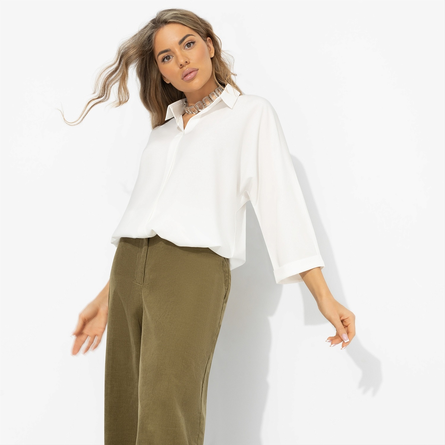 Белый в 2026 году – это не «база», а зявление. На показах Prada и The Row он звучит как знак ясности и внутреннего порядка. Эта блуза моментально переносит вас в утро, когда голова светлая, решения принимаются легко, а внешний вид не отвлекает от главного. Белый здесь не стерильный, а живой. Лёгкая ткань «ниагара» красиво драпируется и мягко движется при ходьбе, а еще легко сочетается с денимом, костюмными брюками, юбками. Вещь для офиса, встреч и тех дней, когда хочется чистоты в образе.
