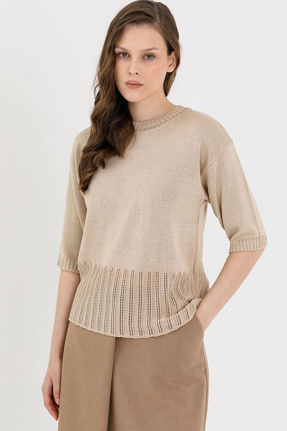 Блуза вязаная бежевого цветас короткими рукавами от фабрики Priz. Модель прямого силуэта, круглый вырез горловины. Рукав втачной. Комфорт и стиль на каждый день., Оттенок цвета может незначительно отличаться от фото., Ожидание отправки (рабочих дней): 7, Размер модели: 44., Рост модели: 174 см., Состав:, Вискоза 60%, Акрил 40%, Тип ткани:, Вязаный трикотаж