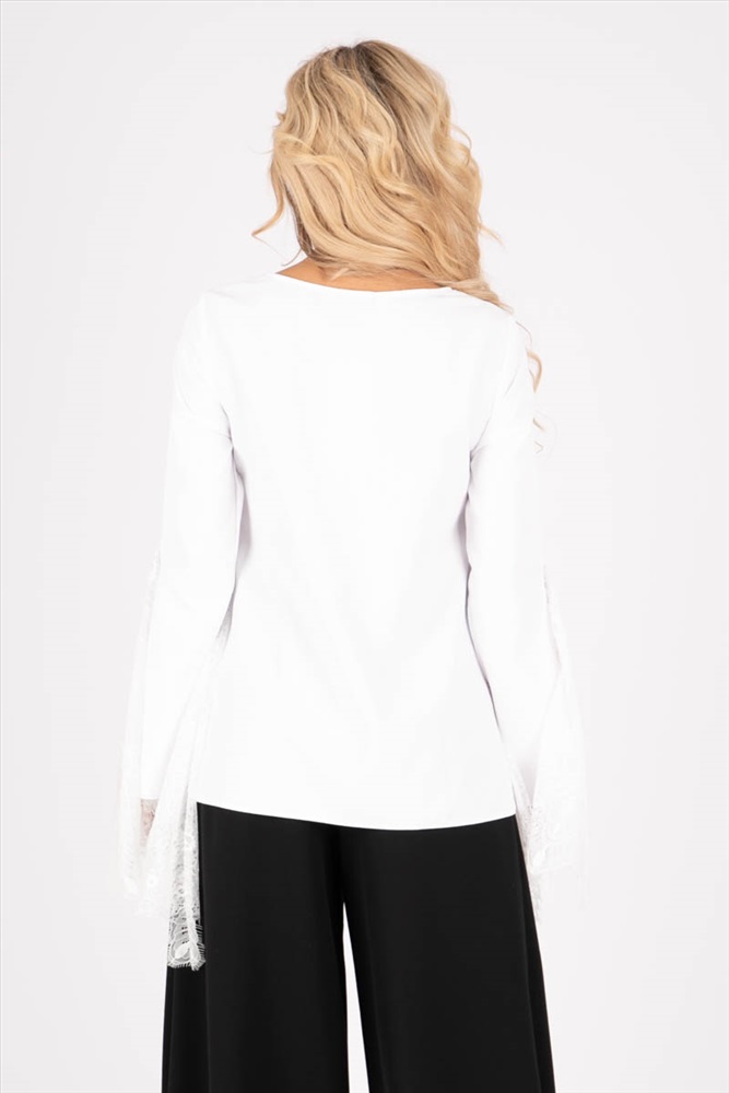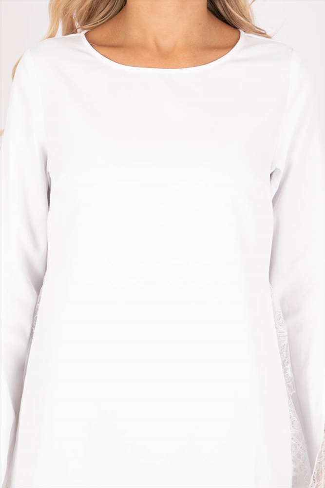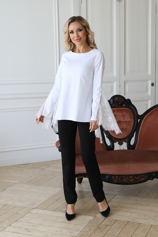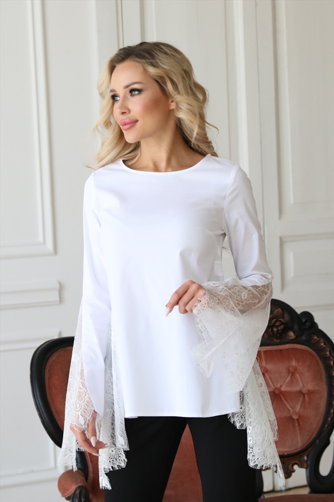 Очаровательная блуза свободного силуэта из текстильного полотна белого цвета. Круглый вырез изделия обработан бейкой. Блуза с втачными рукавами. Рукава и низ изделия по бокам дополнены французским кружевом.