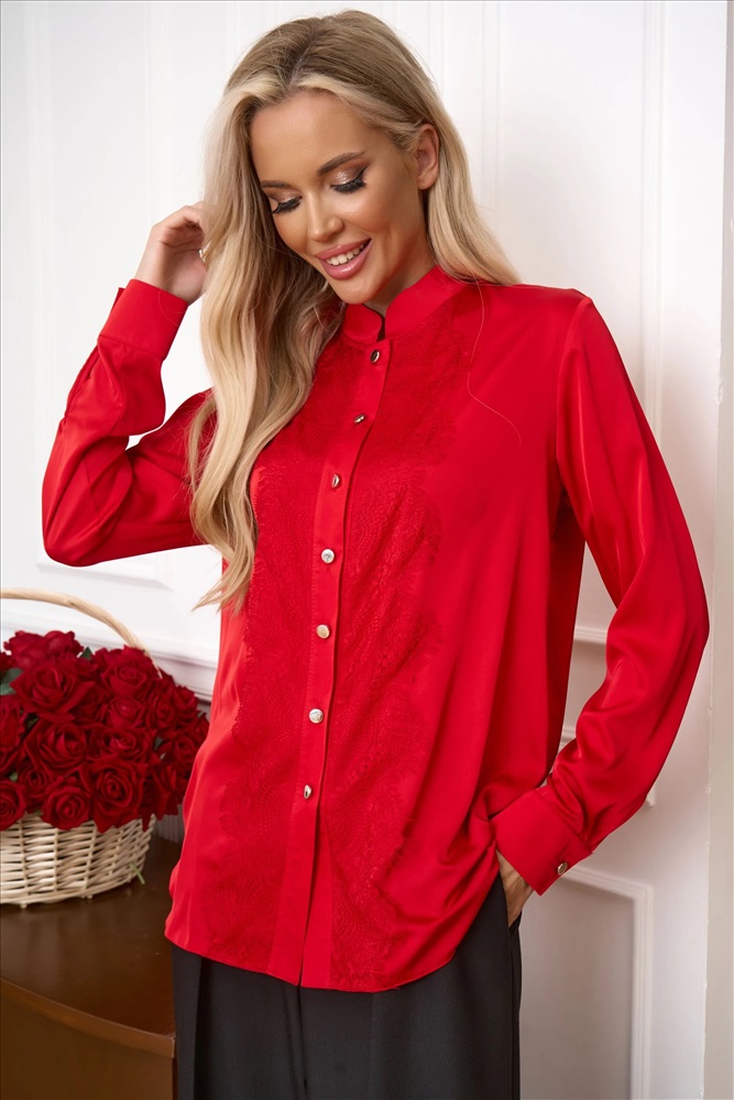 Дизайн: однотонный Фактура материала: Гладкая Сезон: Осень Вид застежки: Пуговица Вид пояса: нет Состав, %: 100% полиэстер Ткань: армани шелк Вырез горловины: рубашечный Красивая блузка из текстильного полотна Перед украшен гипюром Комментарии к товару