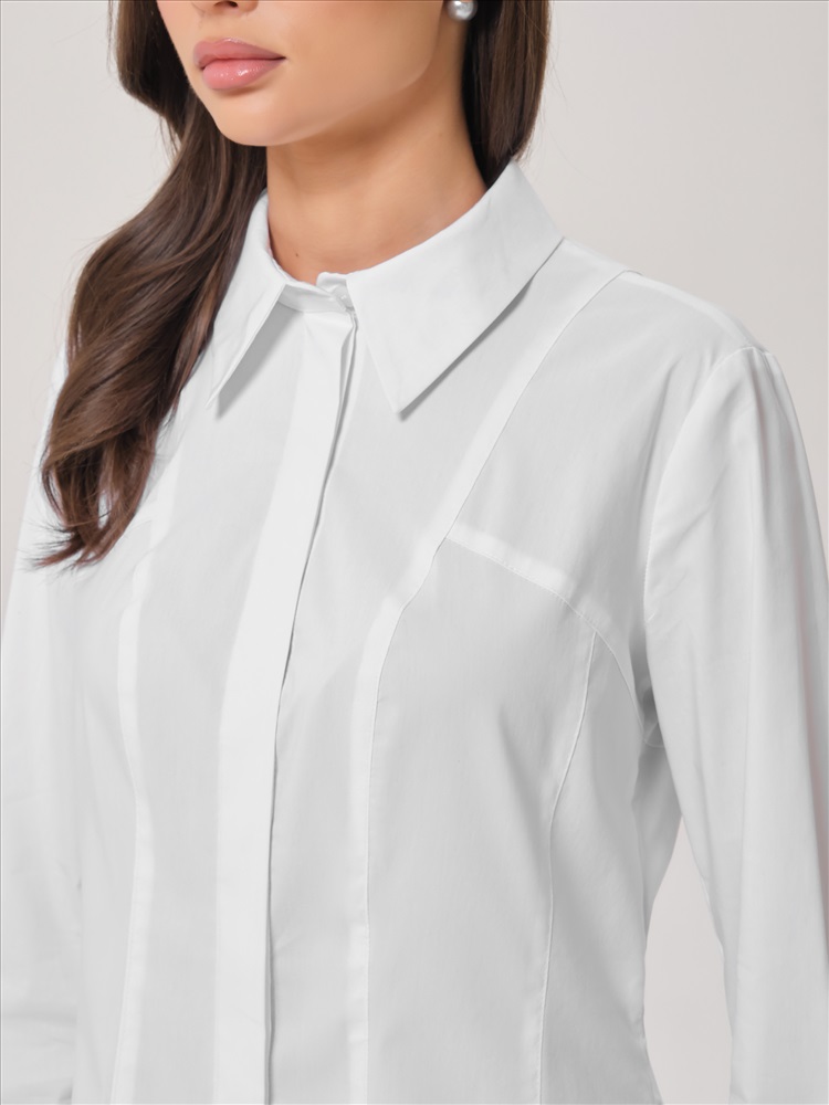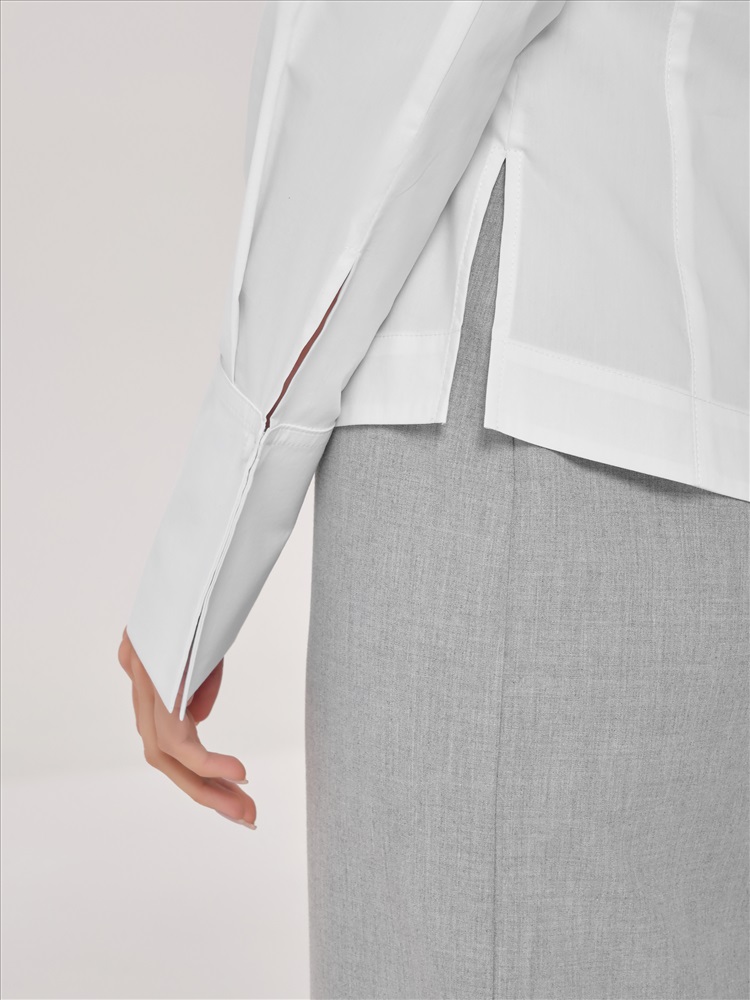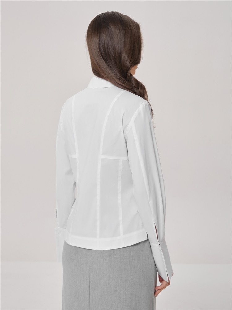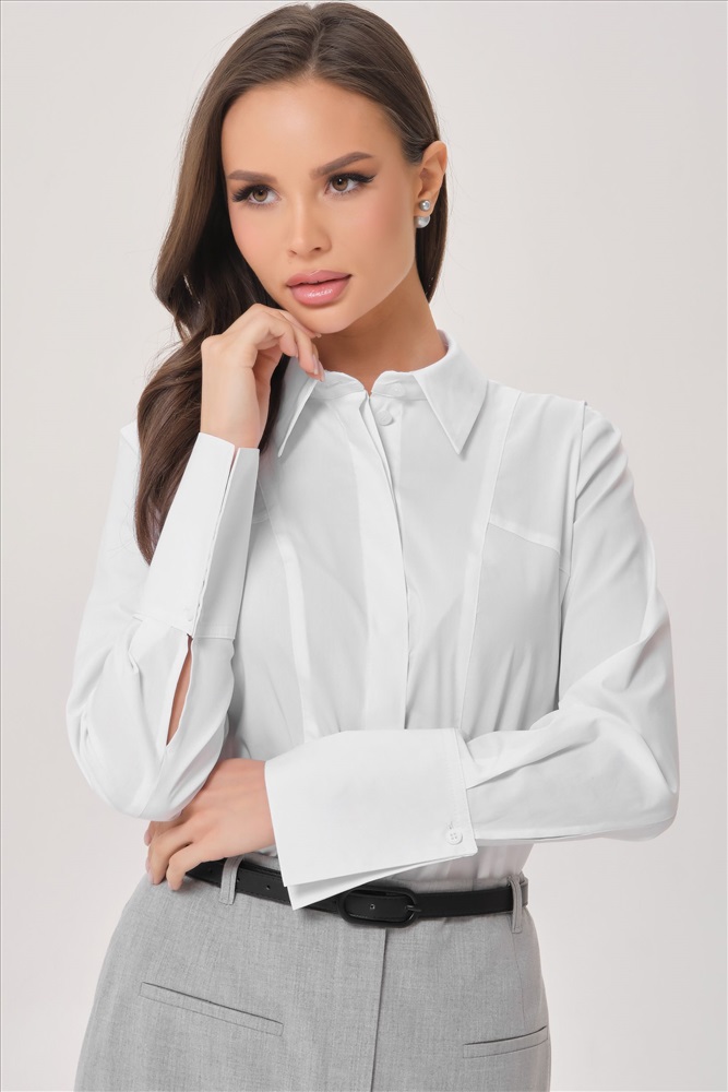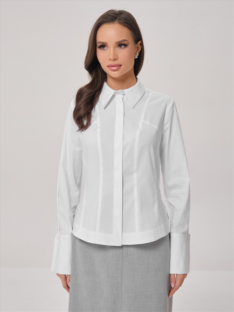 Блузка белая с длинными рукавами от фабрики Priz., Модель, полуприлегающего силуэта, выполнена из текстильного полотна. Перед и спинка с рельефами, кокетками и вертикальными подрезами. Застёжка потайная на петли и пуговицы. Воротник сорочечный. По низу рукава разрез, защип и широкая манжета с застёжкой на пуговицу, имитирующую запонку. В боковых швах разрезы. Низ блузки закруглён. Идеальный выбор для офисных модниц., Оттенок цвета может незначительно отличаться от фото., Ожидание отправки (рабочих дней): 7, Длина: 42р - 61,5 см, 50р - 63 см., Размер модели: 44., Рост модели: 174 см., Состав:, Хлопок 73%, Полиамид 23%, Эластан 4%, Тип ткани:, Текстиль