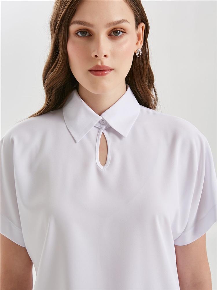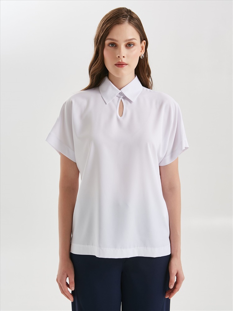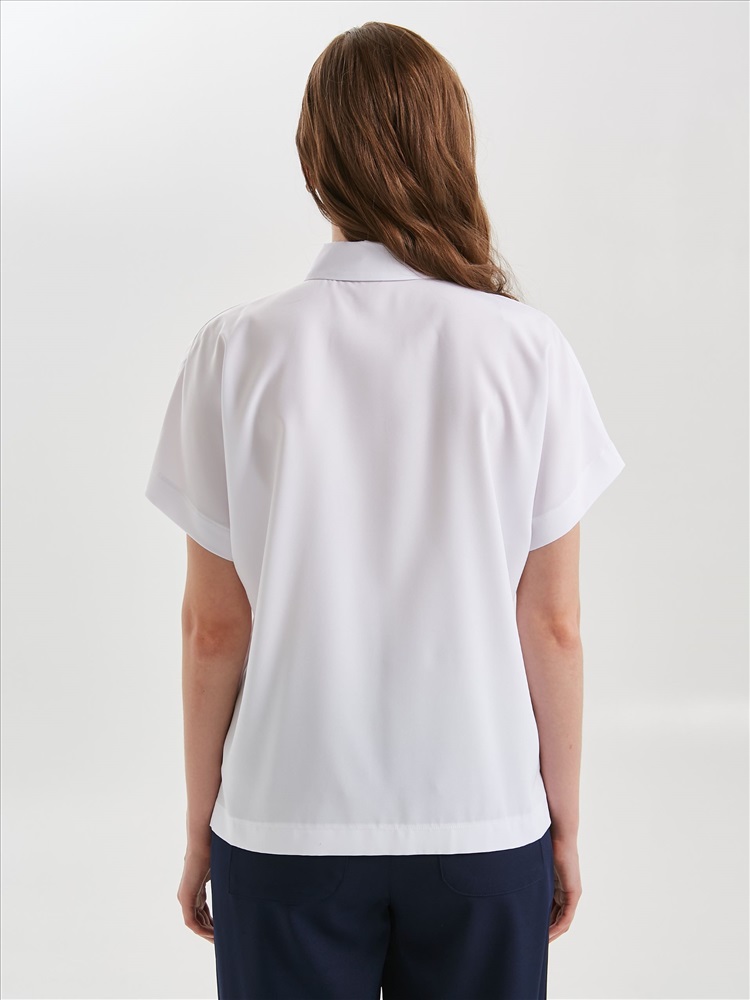Блузка белая с коротким рукавом от фабрики Priz. Модель прямого силуэта, выполнена из текстильного полотна. Спереди окантованный вырез и застёжка на пуговицу на стойке. Воротник сорочечный. Рукава цельнокроенные. В боковых швах небольшие разрезы. Идеальный выбор для офисных модниц., Оттенок цвета может незначительно отличаться от фото., Ожидание отправки (рабочих дней): 7, Длина: в 42 р-ре - 63 см; в 58 р-ре - 68 см., Размер модели: 44., Рост модели: 174 см., Состав:, Полиэстер 65%, Вискоза 30%, Эластан 5%, Тип ткани:, Текстиль
