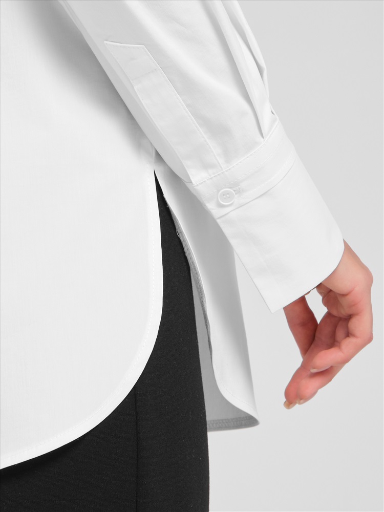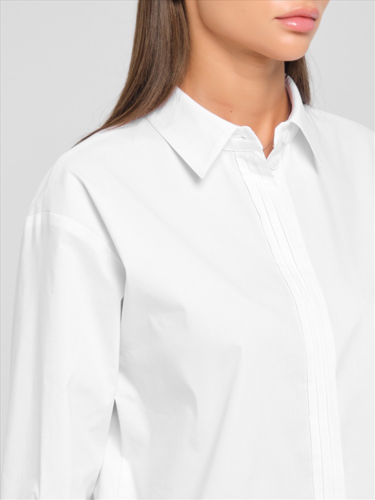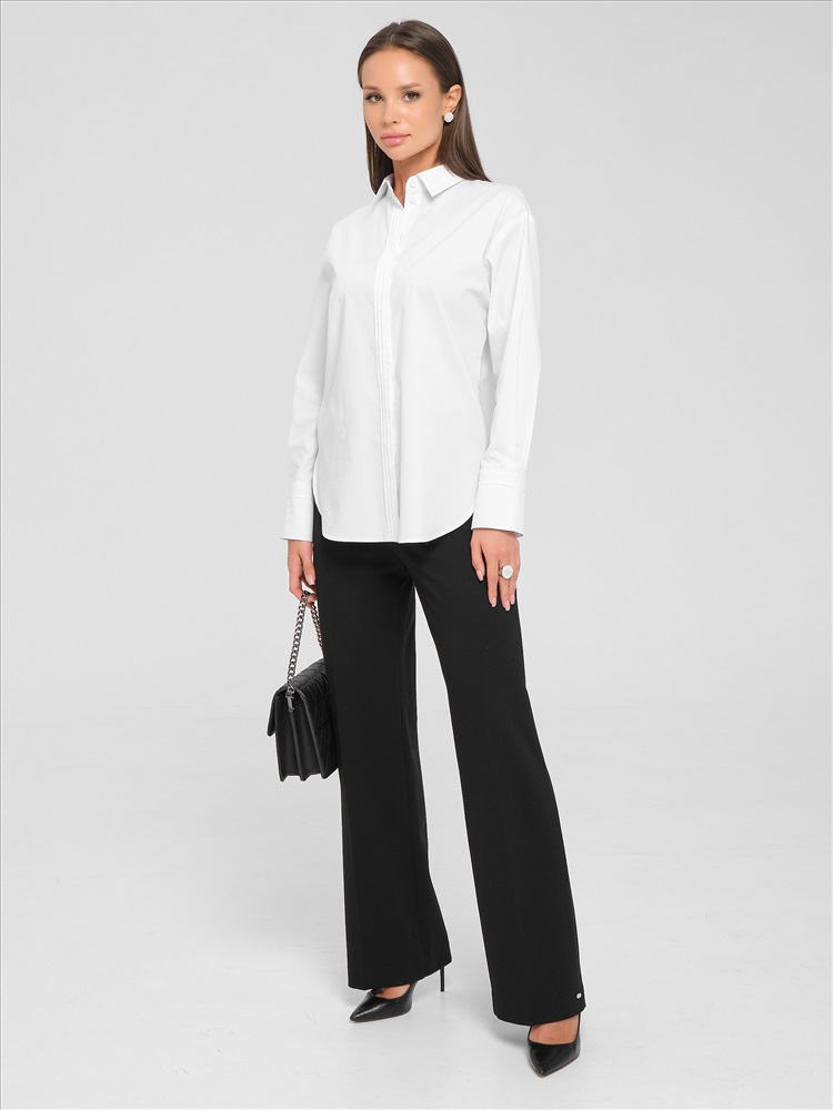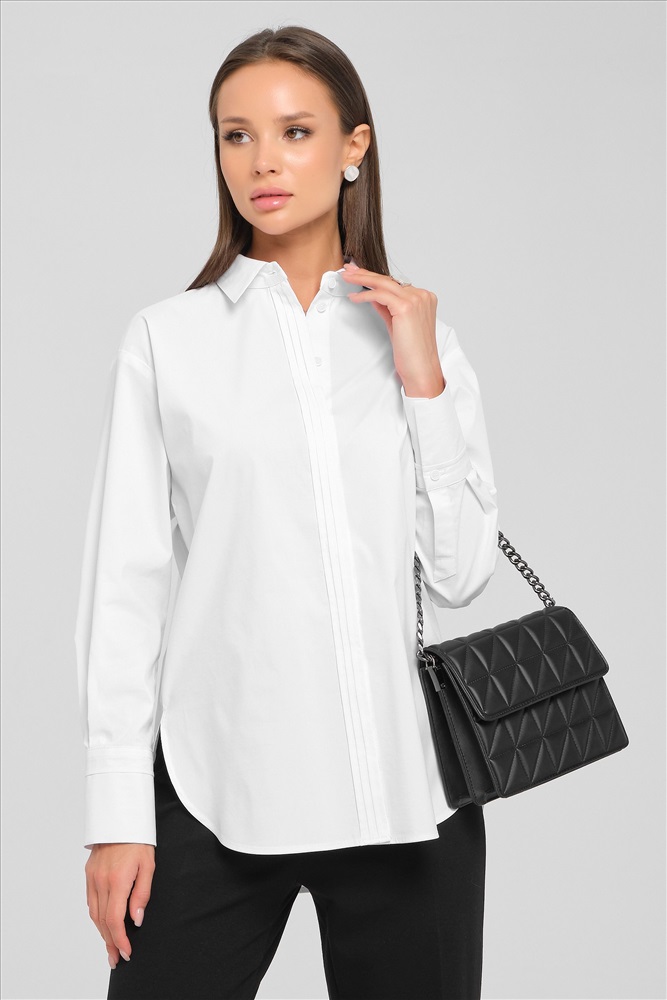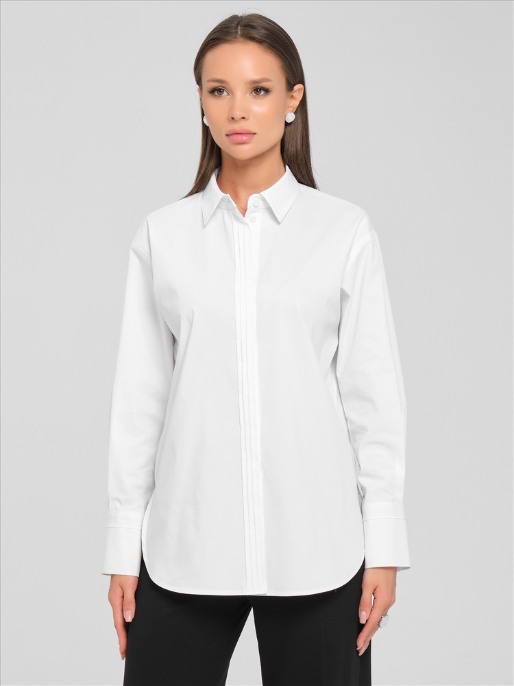 Блузка белая с потайной застёжкой от фабрики Priz. Модель прямого силуэта, выполнена из текстильного полотна. Спинка с кокеткой, под кокеткой складка. По низу рукава защипы, планка и манжета с застёжкой на пуговицы. Спереди по центру и на манжетах застрочены складки. В боковых швах разрезы. Низ блузы закруглён. Идеальный выбор для офисных модниц., Оттенок цвета может незначительно отличаться от фото., Ожидание отправки (рабочих дней): 7, Длина: в 42 р-ре - 77,5 см; в 54 р-ре - 78 см., Размер модели: 44., Рост модели: 174 см., Состав:, Хлопок 65%, Полиэстер 30%, Эластан 5%, Тип ткани:, Текстиль