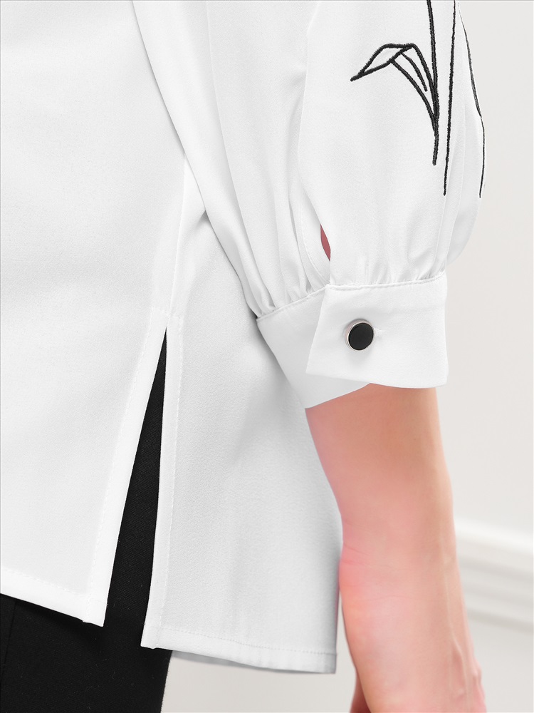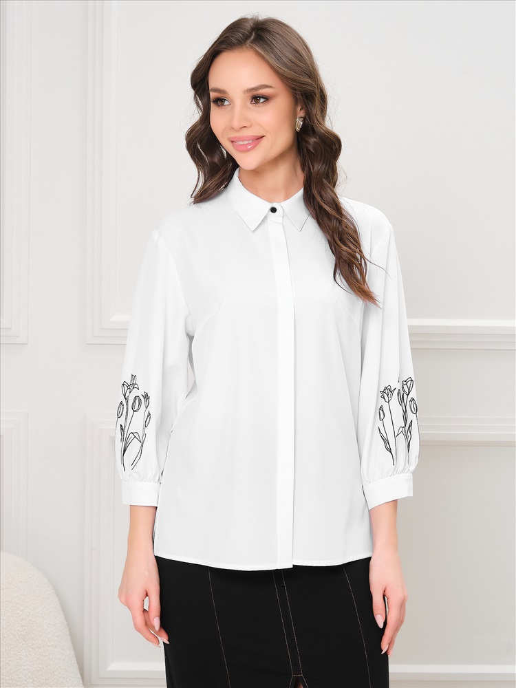 Блузка белая с вышивкой от фабрики Priz. Модель прямого силуэта, выполнена из текстильного полотна. Спереди планка с застёжкой на петли и пуговицы. Воротник сорочечный. Укороченный рукав. В боковых швах разрезы. Идеальный выбор для офисных модниц., Оттенок цвета и расположение рисунка могут незначительно отличаться от фото., Ожидание отправки (рабочих дней): 7, Длина: в 42 р-ре - 67 см; в 54 р-ре - 74,4 см., Размер модели: 44., Рост модели: 174 см., Состав:, Полиэстер 65%, Вискоза 30%, Эластан 5%, Тип ткани:, Текстиль