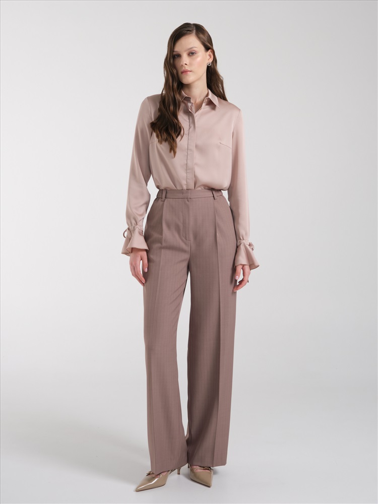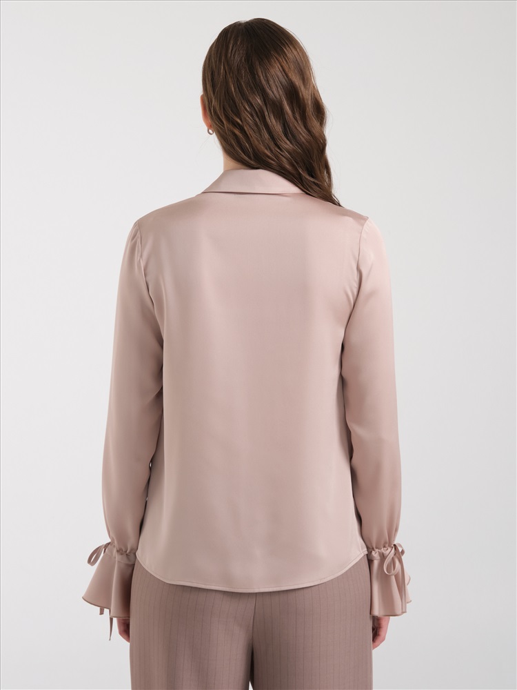 Блузка бежевая с воланом на рукаве от фабрики Priz., Модель, полуприлезающего силуэта, выполнена из текстильного полотна. Блузка с фигурной линией низа. Спереди центральная потайная застёжка на петли и пуговицы. Воротник сорочечный. По низу рукава кулиса с завязками и волан. Идеальный выбор для офисных модниц., Оттенок цвета может незначительно отличаться от фото., Ожидание отправки (рабочих дней): 7, Длина: в росте 164 : 42р - 64 см, 54р - 67 см., Размер модели: 44., Рост модели: 174 см., Состав:, Полиэстер 65%, Вискоза 30%, Эластан 5%, Тип ткани:, Текстиль