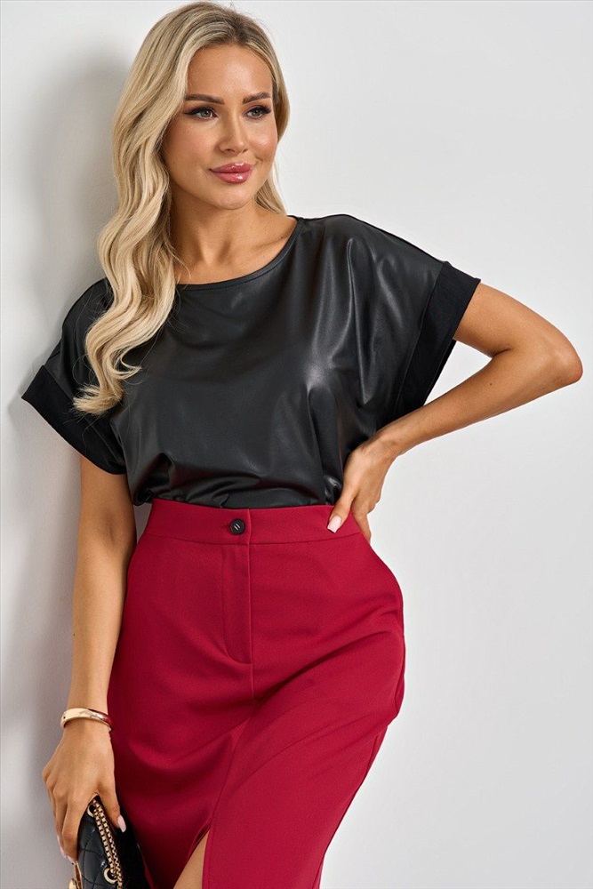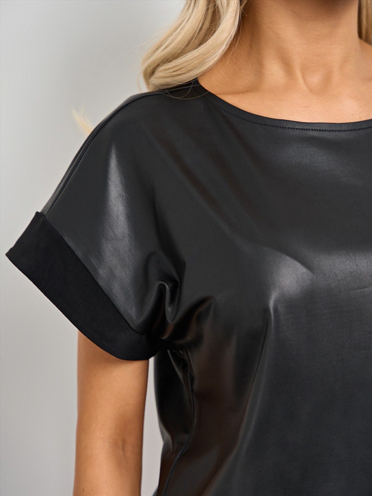 Блузка чёрная из искусственной кожи от компании Jetty. Изделие прямого силуэта, круглый вырез горловины. Короткий цельнокроеный рукав. Прекрасный выбор для Вашего повседневного гардероба., Оттенок цвета может незначительно отличаться от фото., Размер модели: 42., Рост модели: 170 см., Состав:, Полиэстер 95%, Эластан 5%, Тип ткани:, Искусственная кожа