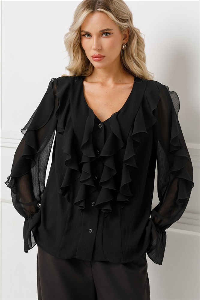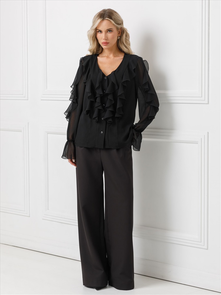 Блузка чёрная из шифона с эффектом креш от фабрики Priz. Модель прямого силуэта, на подкладе. Перед с рельефами. Застёжка центральная на петли и пуговицы. В боковых швах разрезы. Рукав со сборкой на резину на уровне запястья. Блузка декорирована воланами. Идеальный выбор для офисных модниц., Оттенок цвета может незначительно отличаться от фото., Ожидание отправки (рабочих дней): 7, Размер модели: 44., Рост модели: 174 см., Состав:, Вискоза 50%, Полиэстер 50%, Тип ткани:, Шифон