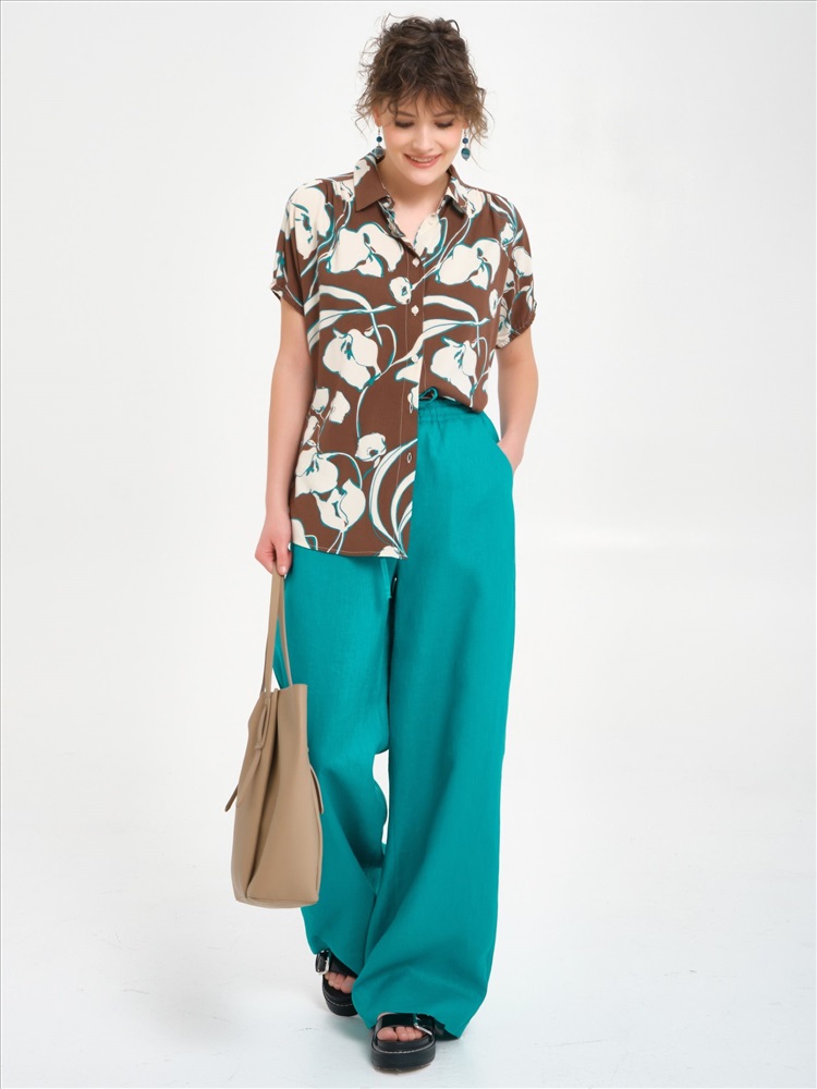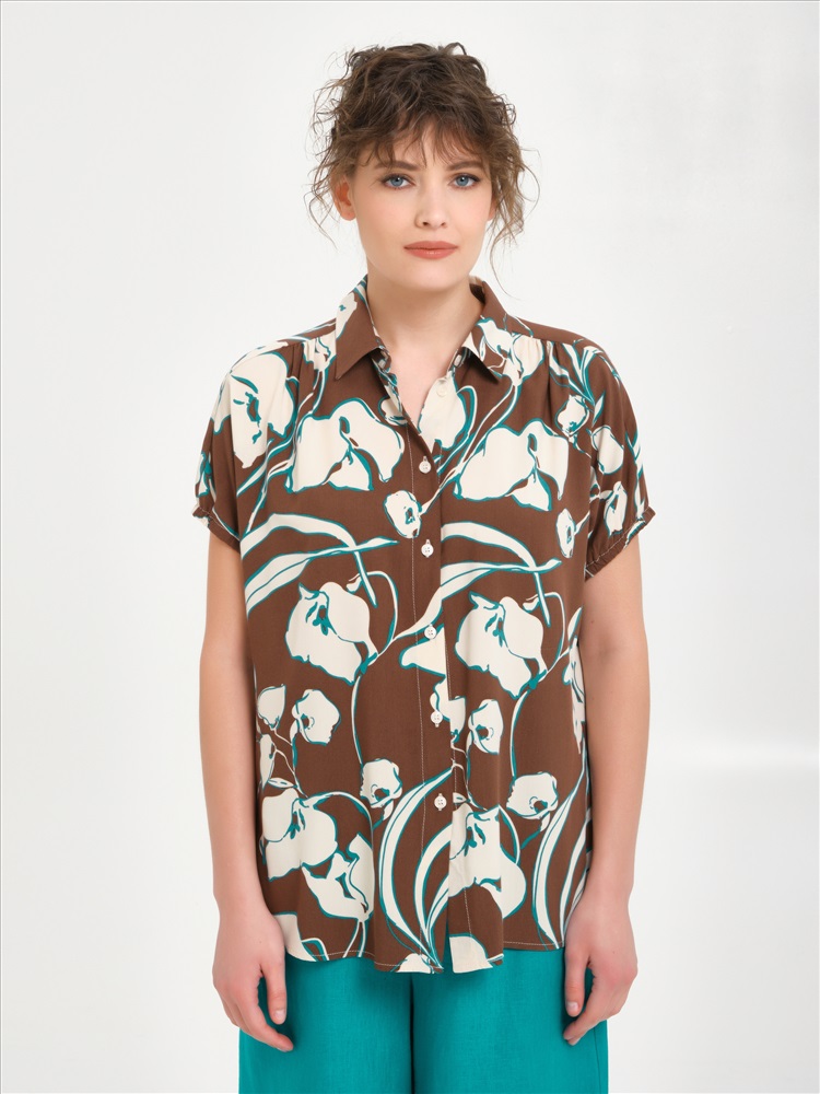 Блузка коричневая с принтом от фабрики Priz, выполнена из текстильного полотна., Модель, прямого силуэта, с коротким цельнокроеным рукавом. Низ рукава собран на резину. Перед с кокетками, переходящими на рукава. Под кокетками сборка. В боковых швах разрезы. Идеальный выбор для офисных модниц., Оттенок цвета и расположение рисунка могут незначительно отличаться от фото., Ожидание отправки (рабочих дней): 7, Длина: в 42 р-ре - 67,5 см, в 52 р-ре - 70,5 см., Размер модели: 44., Рост модели: 174 см., Состав:, Вискоза 100%, Тип ткани:, Текстиль