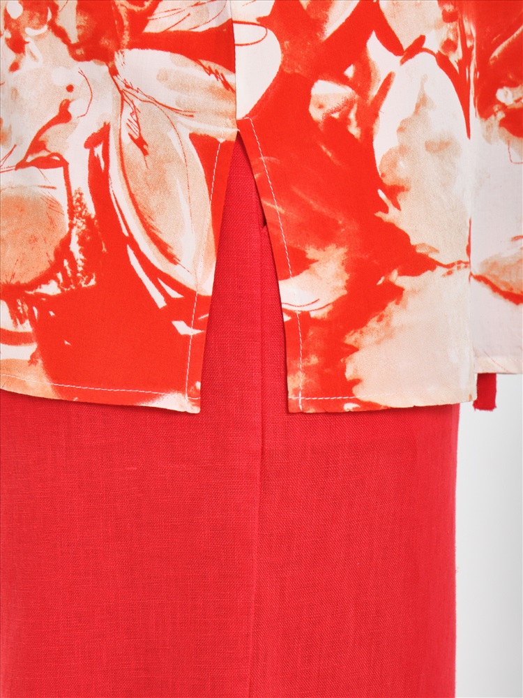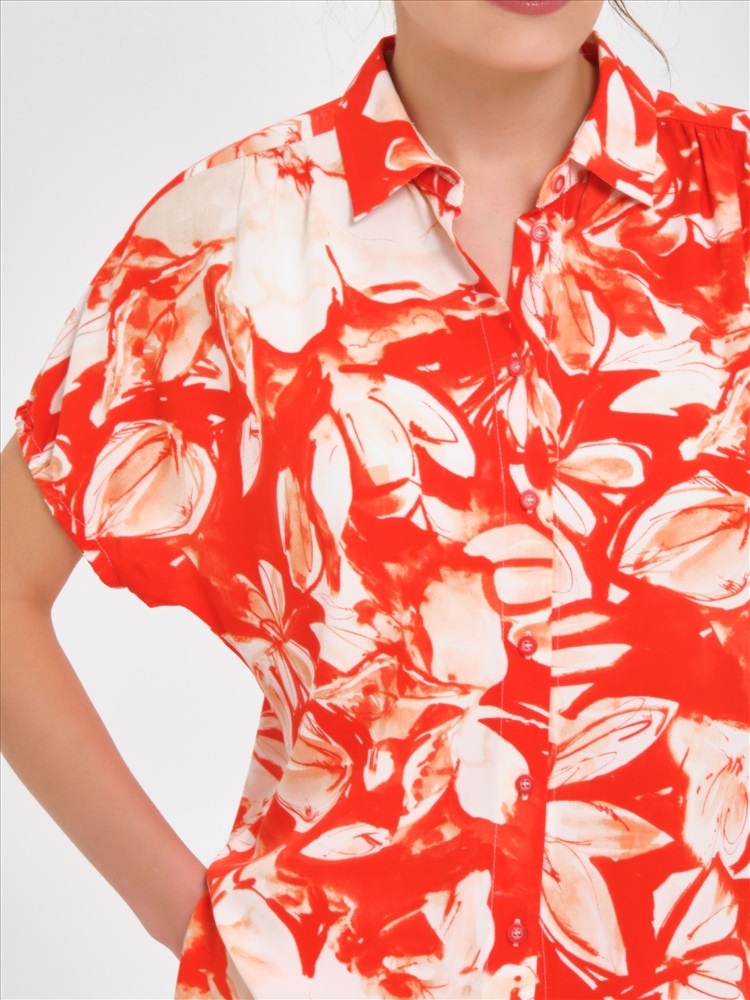 Блузка красная с принтом от фабрики Priz, выполнена из текстильного полотна., Модель, прямого силуэта, с коротким цельнокроеным рукавом. Низ рукава собран на резину. Перед с кокетками, переходящими на рукава. Под кокетками сборка. В боковых швах разрезы. Идеальный выбор для офисных модниц., Оттенок цвета и расположение рисунка могут незначительно отличаться от фото., Ожидание отправки (рабочих дней): 7, Длина: в 42 р-ре - 67,5 см, в 52 р-ре - 70,5 см., Размер модели: 44., Рост модели: 174 см., Состав:, Вискоза 100%, Тип ткани:, Текстиль