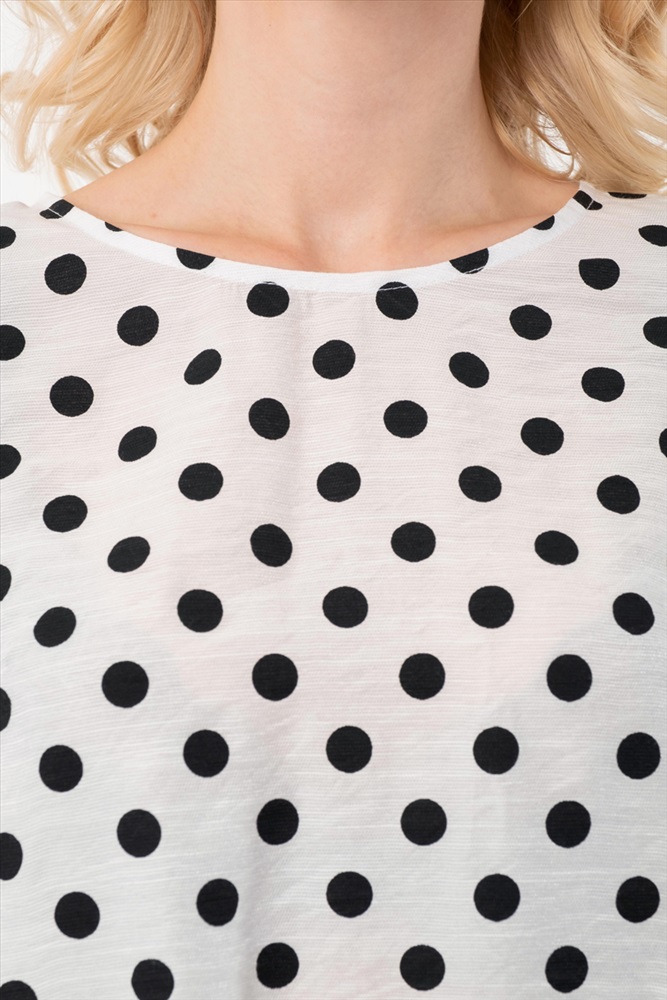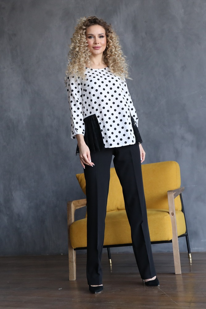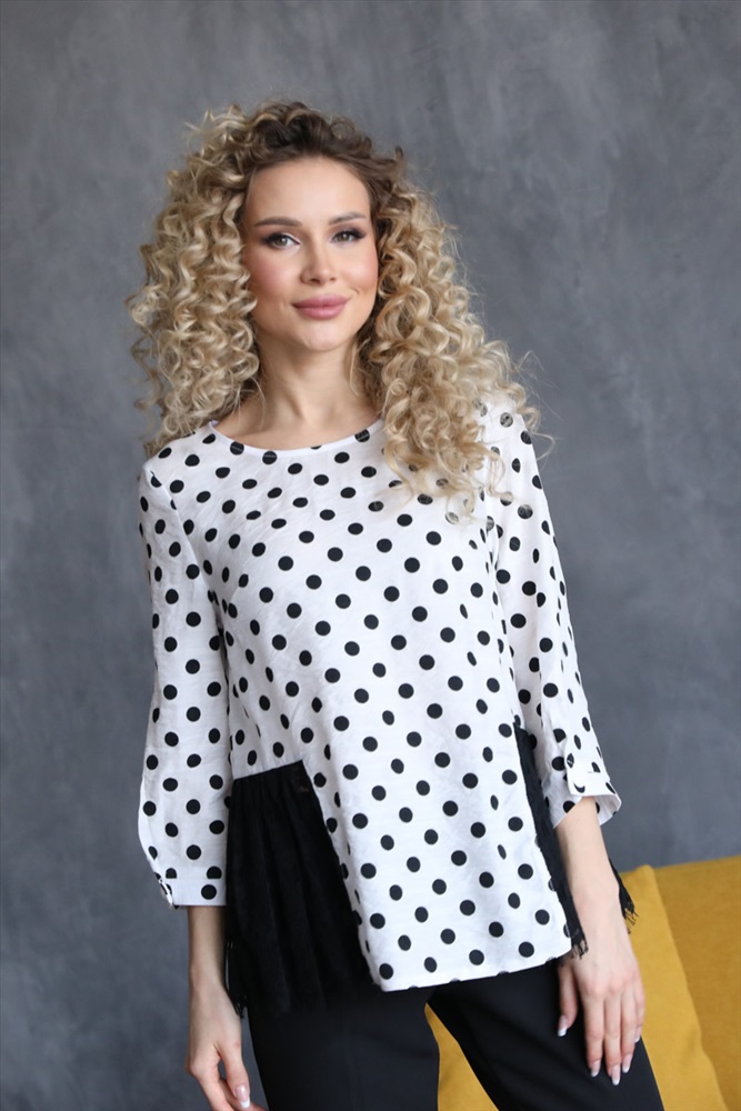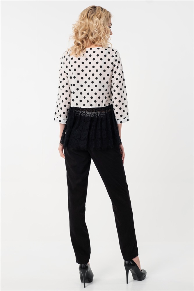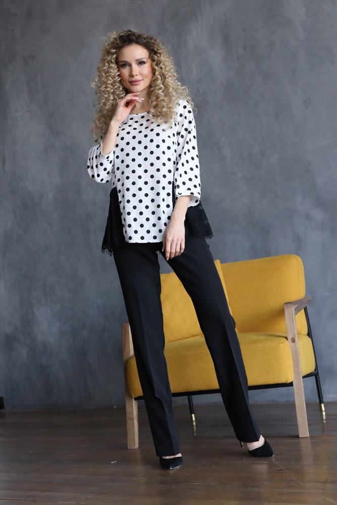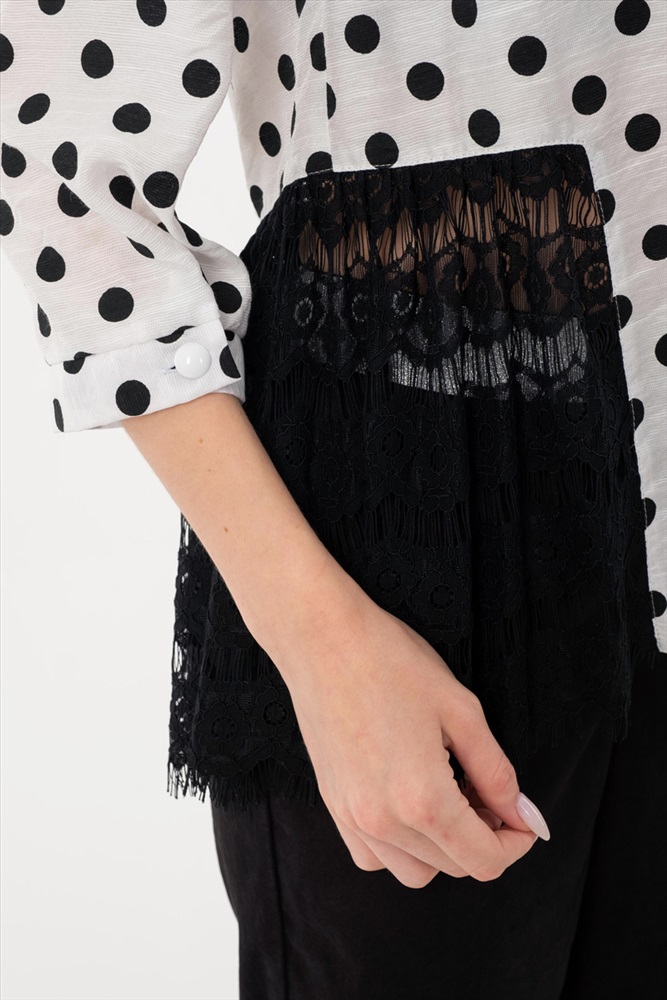 Роскошная блузка прямого силуэта из текстильного полотна бело-черного цвета с эффектным принтом «горох». Круглый вырез изделия обработан внутренней бейкой. Изделие дополнено широкой вставкой из полупрозрачного кружева. Аксессуары в комплект не входят.