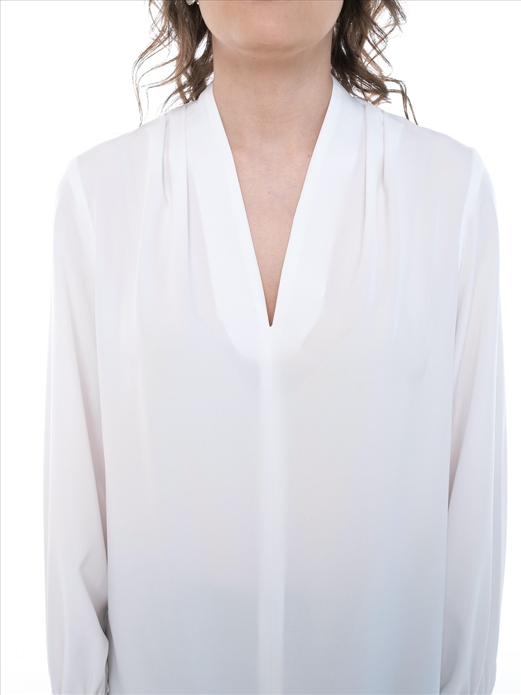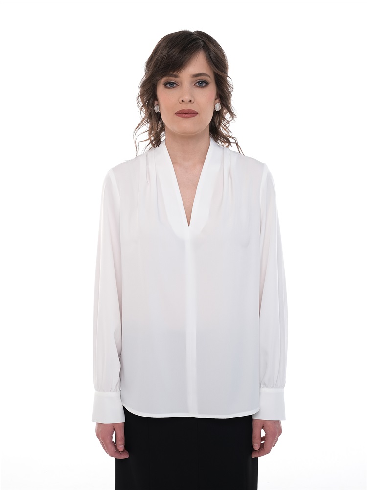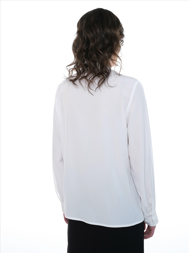 Блузка молочного цвета с длинным рукавом от фабрики Priz. Модель прямого силуэта, выполнена из текстильного полотна. Блузка с цельнокроеным воротником стойкой и V-образным вырезом горловины. Перед со средним шом и защипами по плечевым швам. По низу рукава разрез, сборка и манжета с застёжкой на пуговицы. Идеальный выбор для офисных модниц., Оттенок цвета может незначительно отличаться от фото., Ожидание отправки (рабочих дней): 7, Длина: в 42 р-ре - 64,5 см; в 58 р-ре - 69,5 см., Размер модели: 44., Рост модели: 174 см., Состав:, Полиэстер 65%, Вискоза 30%, Эластан 5%, Тип ткани:, Текстиль