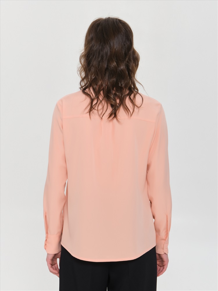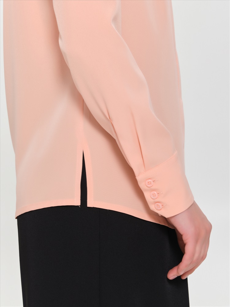 Блузка персикового цвета с длинным рукавом от фабрики Priz., Модель, прямого силуэта, выполнена из текстильного полотна. Спереди потайная застёжка на петли и пуговицы. Спинка с кокеткой, под кокеткой защипы. По низу рукава окантованный разрез, защип и фигурная притачная манжета с застёжкой на петли и пуговицы. Воротник сорочечный. Низ блузки фигурный. В боковых швах разрезы. Идеальный выбор для офисных модниц., Оттенок цвета может незначительно отличаться от фото., Ожидание отправки (рабочих дней): 7, Длина: в росте 164 : в 42 р-ре - 66 см, в 58 р-ре - 67,5 см., Размер модели: 44., Рост модели: 174 см., Состав:, Полиэстер 65%, Вискоза 30%, Эластан 5%, Тип ткани:, Текстиль
