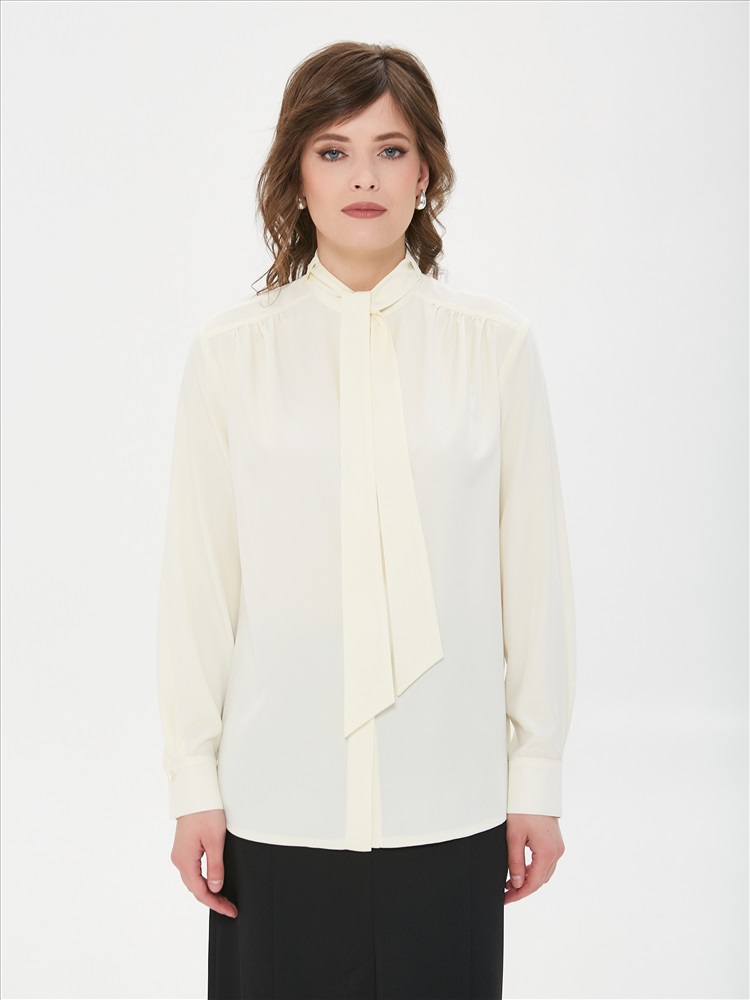 Блузка с бантом цвета слоновая кость от фабрики Priz. Модель прямого силуэта, выполнена из текстильного полотна. Перед с кокетками, под кокетками сборка. В боковых швах разрезы. По низу рукава разрез, защипы и манжета с застёжкой на пуговицу. Идеальный выбор для офисных модниц., Оттенок цвета может незначительно отличаться от фото., Ожидание отправки (рабочих дней): 7, Длина: в 42 р-ре - 67 см; в 54 р-ре - 68 см., Размер модели: 44., Рост модели: 174 см., Состав:, Полиэстер 65%, Вискоза 30%, Эластан 5%, Тип ткани:, Текстиль