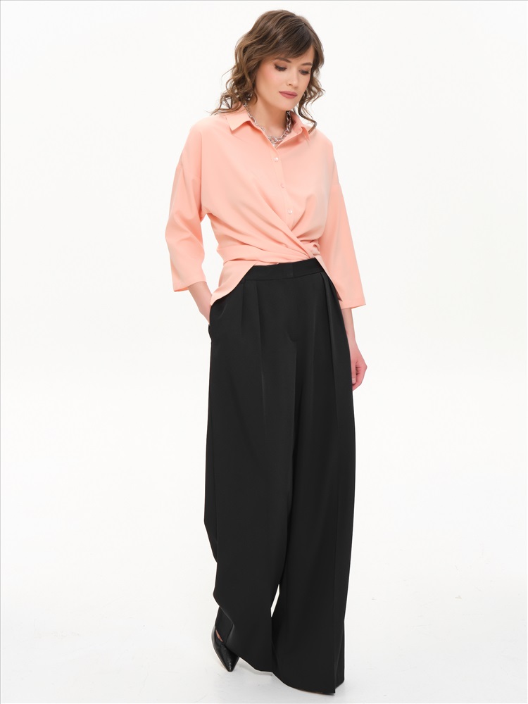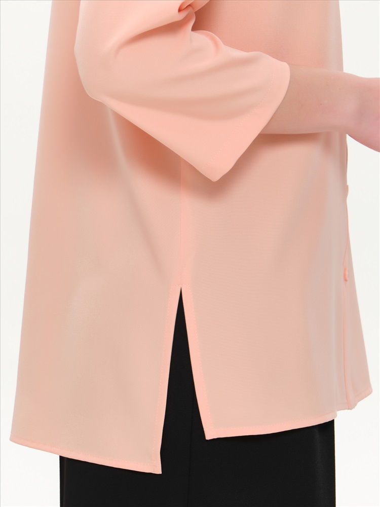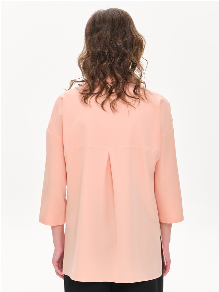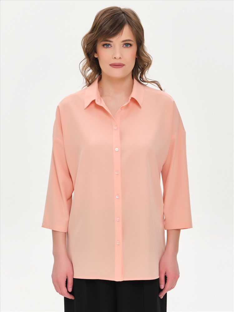 Блузка с рукавом 3/4 от фабрики Priz. Модель прямого силуэта, со спущенным плечом, выполнена из текстильного полотна персикового оттенка. Спереди планка с застёжкой на петли и пуговицы. Спинка с кокеткой, под кокеткой складка. В боковых швах разрезы. Низ блузы разноуровневый, длиннее по спинке. Воротник сорочечный. Идеальный выбор для офисных модниц., Оттенок цвета может незначительно отличаться от фото., Ожидание отправки (рабочих дней): 7, Длина: в 42 р-ре - 74 см; в 56 р-ре - 77 см., Размер модели: 44., Рост модели: 174 см., Состав:, Полиэстер 65%, Вискоза 30%, Эластан 5%, Тип ткани:, Текстиль