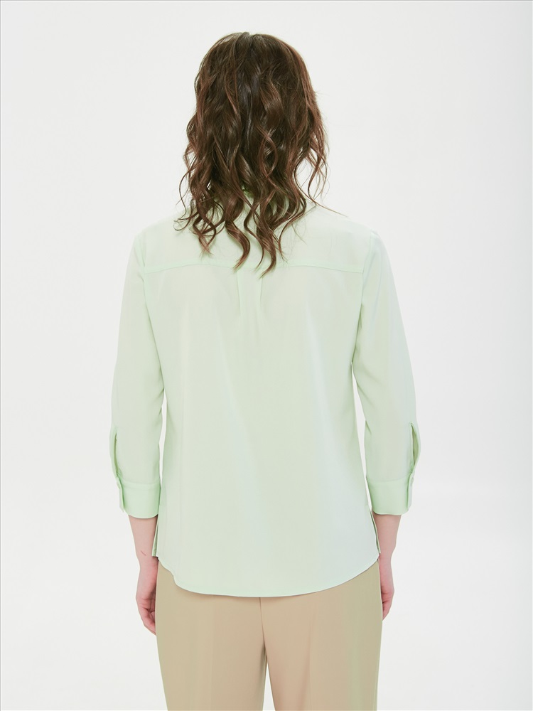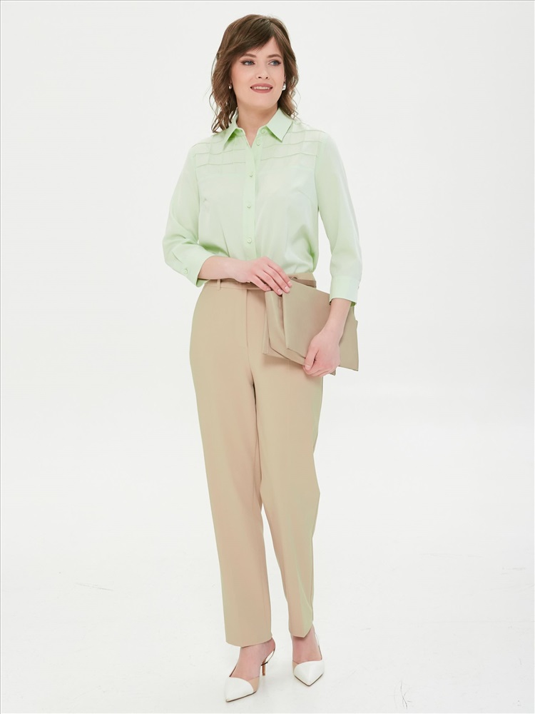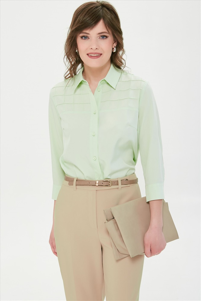 Блузка с рукавом 3/4 от фабрики Priz. Модель прямого силуэта, со спущенным плечом, выполнена из текстильного полотна бледно-зелёного оттенка.  Блузка с кокетками. На кокетках переда застрочены вертикальные и горизонтаьные складки. Под кокеткой спинки заложена складка. По низу рукава разрез, защип и манжета с застёжкой на петлю и пуговицу. В боковых швах разрезы. Низ блузы закруглён. Идеальный выбор для офисных модниц., Оттенок цвета может незначительно отличаться от фото., Ожидание отправки (рабочих дней): 7, Длина: в 42 р-ре - 66 см; в 56 р-ре - 69,5 см., Размер модели: 44., Рост модели: 174 см., Состав:, Полиэстер 65%, Вискоза 30%, Эластан 5%, Тип ткани:, Текстиль