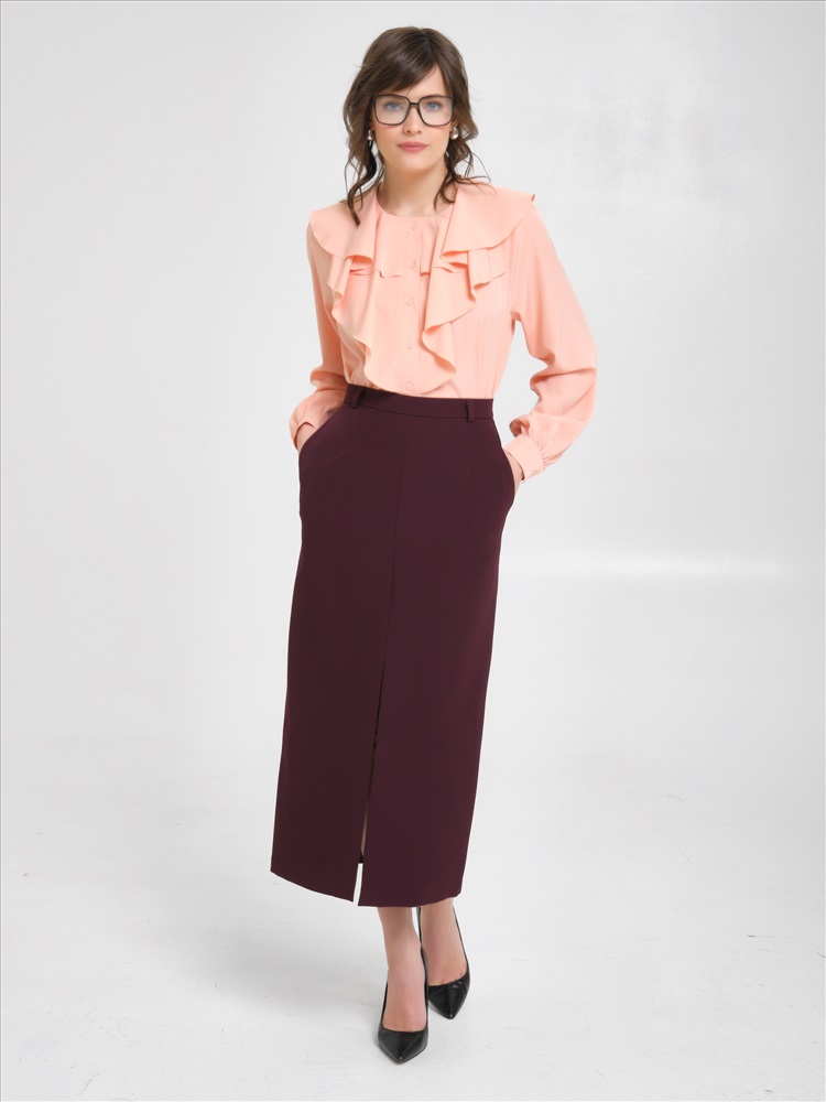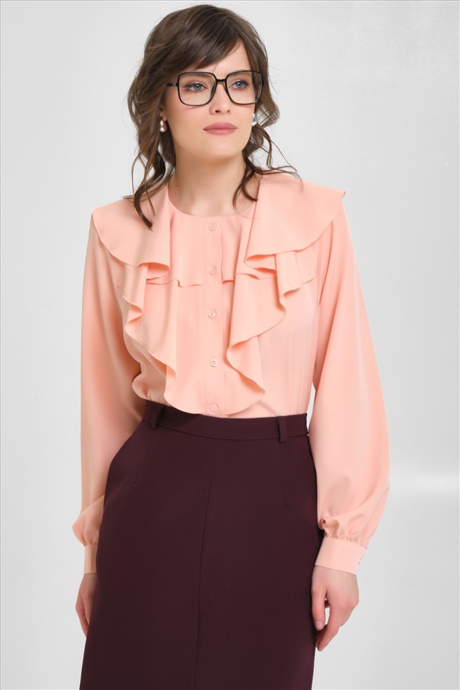 Блузка с воланами в персиковом цвете от фабрики Priz. Модель прямого силуэта, выполнена из текстильного полотна. Спереди застёжка на петли и пуговицы. Круглый вырез горловины. Длинные рукава с манжетой и застёжкой на пуговицу. Идеальный выбор для офисных модниц., Оттенок цвета может незначительно отличаться от фото., Ожидание отправки (рабочих дней): 7, Длина: в 42 р-ре - 66 см; в 54 р-ре - 69 см., Размер модели: 44., Рост модели: 174 см., Состав:, Полиэстер 65%, Вискоза 30%, Эластан 5%, Тип ткани:, Текстиль