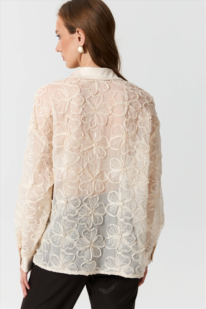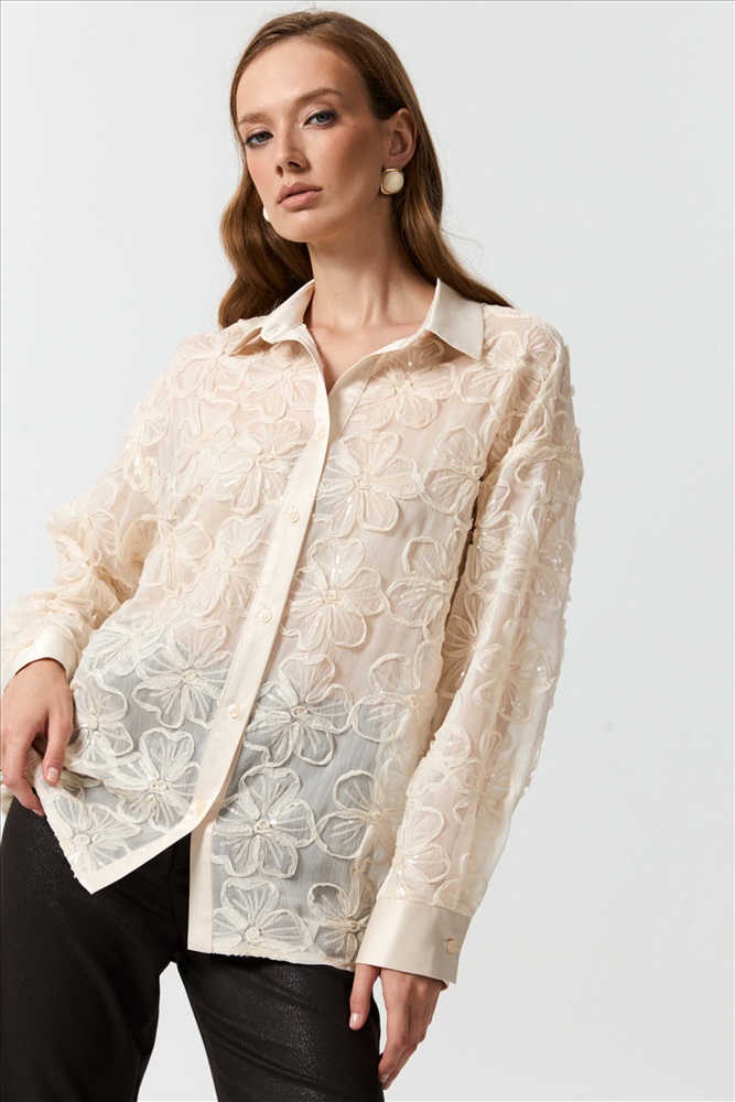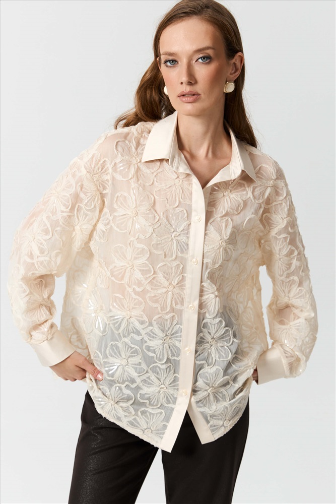 Состав: 100% полиэстер Длина: 71 см (42 размер) 73 см (52 размер) Цветовая гамма: Сливочный Силуэт: Свободный Принт: Нет Коллекция: Новый год 2026 Эффектная блуза из шифона с объемными цветами и пайетками. Модель свободного силуэта. Рукав спущенный с манжетой на петлю и пуговицу. По переду застежка на петли и пуговицы. Воротник, планка и манжеты выполнены из атласа - компаньона. Комментарии к товару