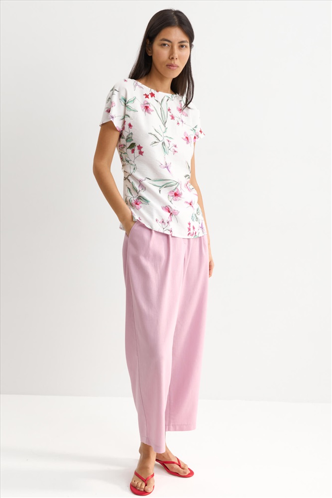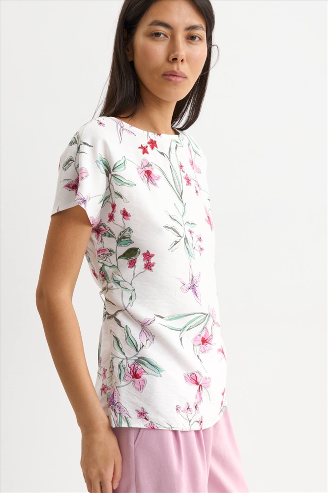 Комфортная блуза из фактурной вискозы с тонким поясом. Модель прямого силуэта. Спущенная линия плеча. В боковых швах разрезы. В комплекте тонкий пояс из основного материала.