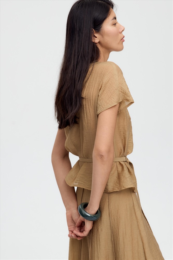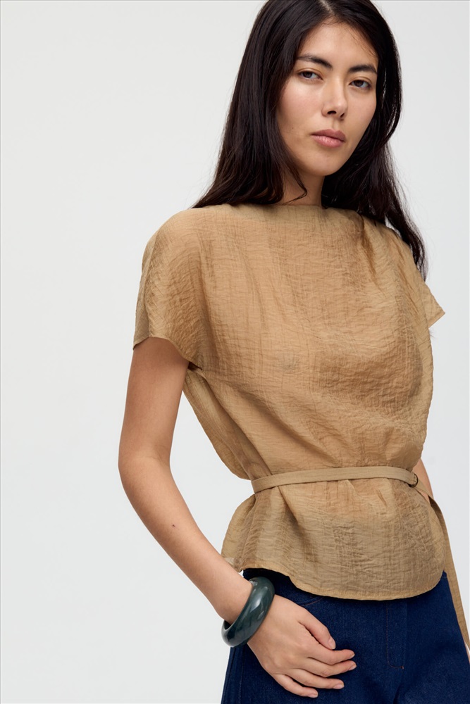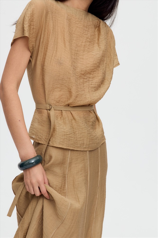 Топ из фактурной вискозы в благородном оттенке. Модель прямого силуэта, рукав спущенный. По плечевому шву ассиметричные складки. В комплекте тонкий пояс с фиксацией на металлические полукольца.