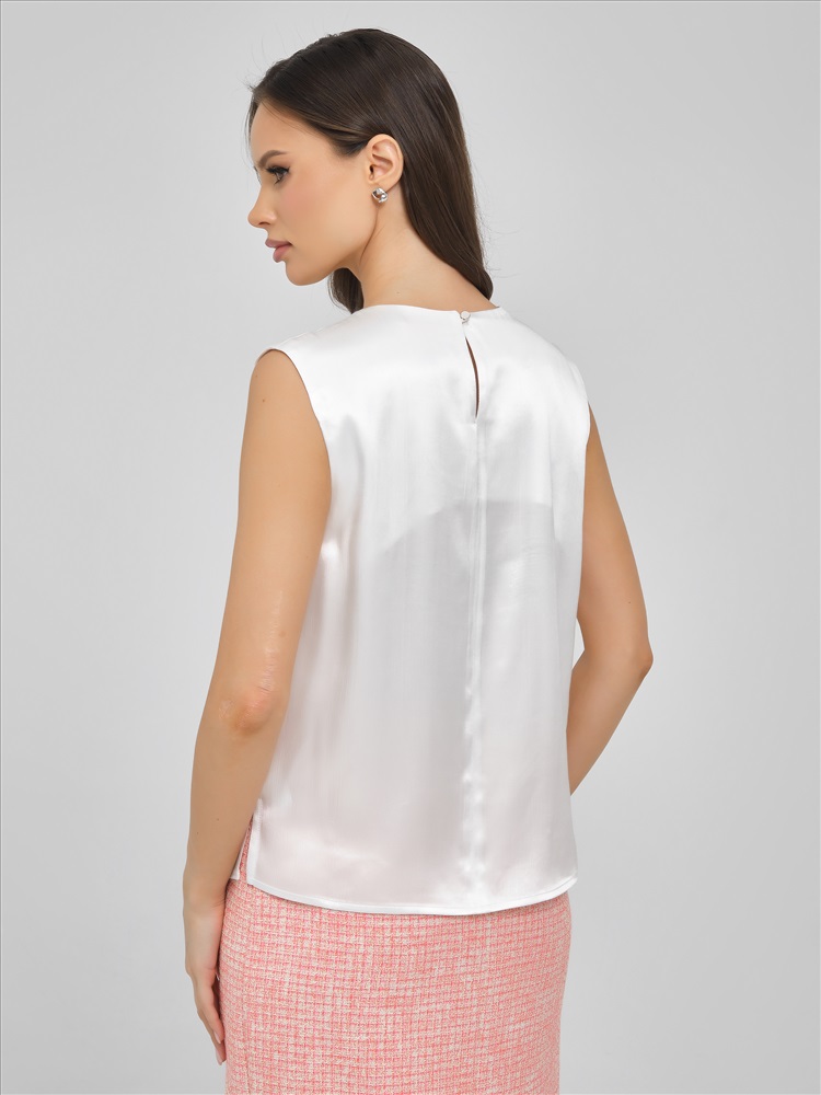 Блузка со складками без рукавов от фабрики Priz. Модель прямого силуэта, выполнена из текстильного полотна молочного цвета. Спереди по горловине складки. Сзади в среднем шве разрез и застёжка на пуговицу и воздушную петлю. В боковых швах разрезы. Низ блузки закруглён. Идеальный выбор для офисных модниц., Оттенок цвета может незначительно отличаться от фото., Ожидание отправки (рабочих дней): 7, Длина: в 42 р-ре - 59 см; в 48 р-ре - 60,5 см., Размер модели: 44., Рост модели: 174 см., Состав:, Полиэстер 70%, Вискоза 30%, Тип ткани:, Текстиль