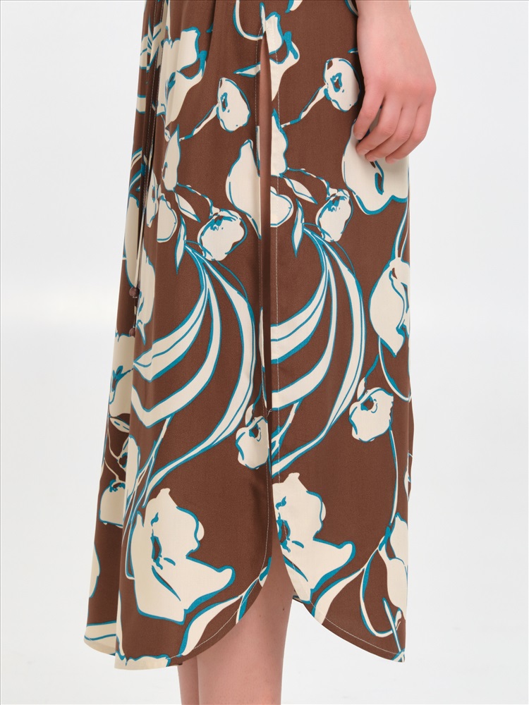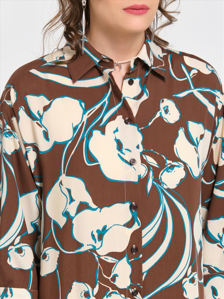 Блузка удлинённая коричневая из вискозы от фабрики Priz. Модель прямого силуэта, со спущенным плечом. Спереди центральная застёжка на петли и пуговицы. Спинка с кокеткой, переходящей на перед. Под кокеткой складка. Воротник сорочечный. По низу рукава разрез, защипы и манжета с застёжкой на пуговицу. В боковых швах разрезы. Низ блузки закруглён. Талия подчёркнута двойным тонким завязывающимся поясом с наконечниками, вставленным в шлёвки. Идеальный выбор для городских модниц., Оттенок цвета и расположение рисунка могут незначительно отличаться от фото., Ожидание отправки (рабочих дней): 7, Размер модели: 44., Рост модели: 174 см., Состав:, Вискоза 100%, Тип ткани:, Вискоза