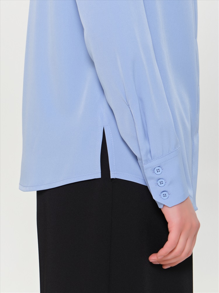 Блузка василькового цвета с длинным рукавом от фабрики Priz., Модель, прямого силуэта, выполнена из текстильного полотна. Спереди потайная застёжка на петли и пуговицы. Спинка с кокеткой, под кокеткой защипы. По низу рукава окантованный разрез, защип и фигурная притачная манжета с застёжкой на петли и пуговицы. Воротник сорочечный. Низ блузки фигурный. В боковых швах разрезы. Идеальный выбор для офисных модниц., Оттенок цвета может незначительно отличаться от фото., Ожидание отправки (рабочих дней): 7, Длина: в росте 164 : в 42 р-ре - 66 см, в 58 р-ре - 67,5 см., Размер модели: 44., Рост модели: 174 см., Состав:, Полиэстер 65%, Вискоза 30%, Эластан 5%, Тип ткани:, Текстиль