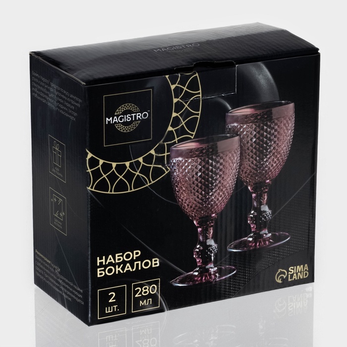 Производитель: Magistro; Габариты: 18 x 9 x 17; Страна: Китай; В боксе: 24 набор; В наборе: 2 набор; Состав: Стекло; Материалы: стекло; Фасовка: по 1 набор; Индивидуальная упаковка: Цветная картонная коробка; Габариты товара: 8 см × 8 см × 15,5 см; Сертификат: СТР; Набор: Да; Цвет: Розовый; В наборе, шт.: 2; Объём, мл: 280; Вид упаковки: Коробка картонная; Рисунок: Нет; Назначение: Для вина; Материал: Стекло; Для детей до 3 лет: Нет; Можно мыть в посудомоечной машине: Да; Текстура: С рельефом; Особенности: Без особенностей; Фиксированная цена: Да