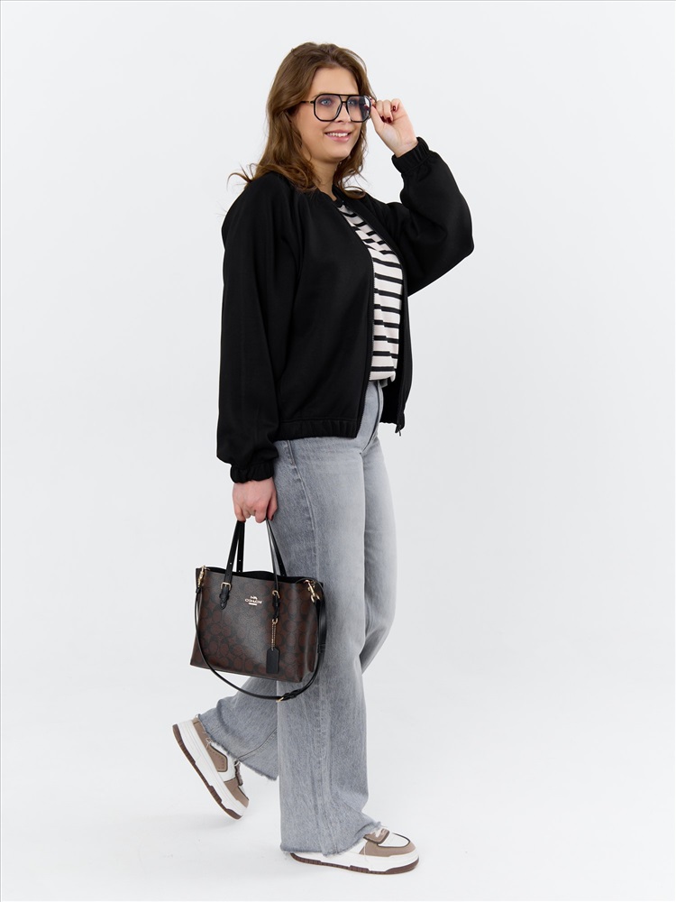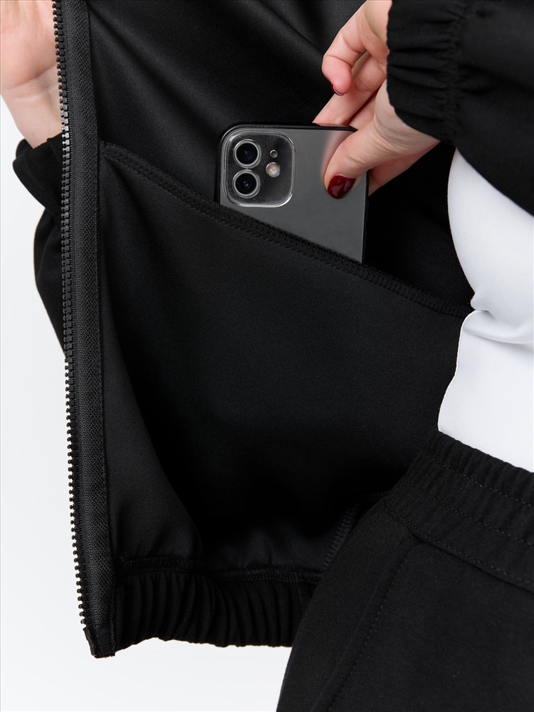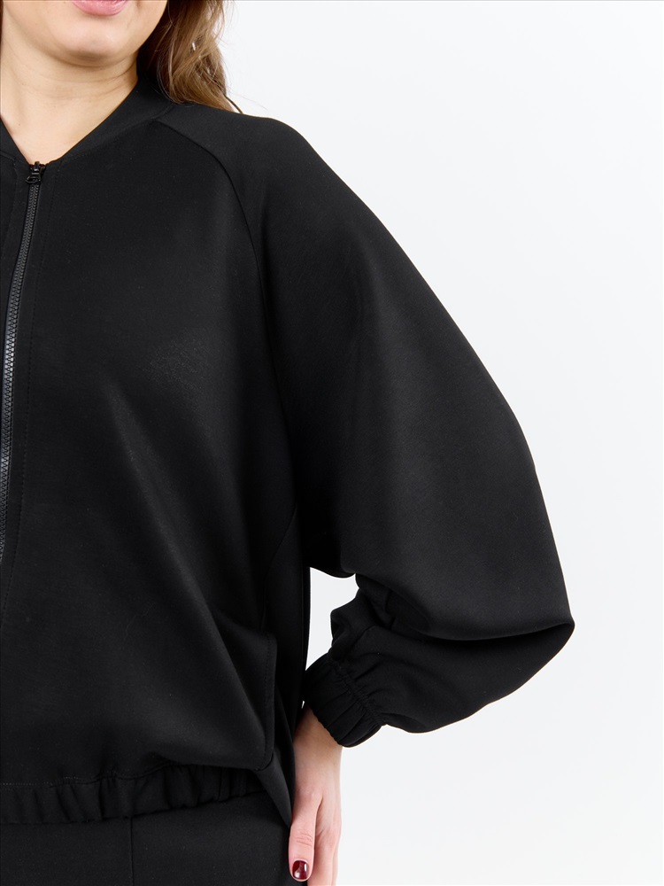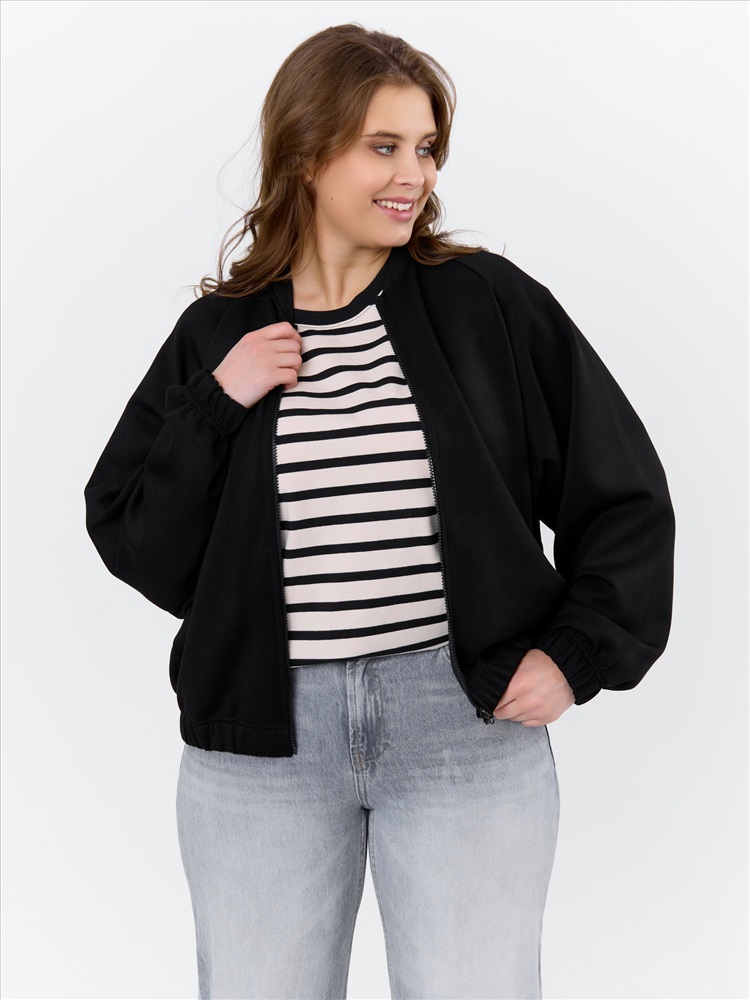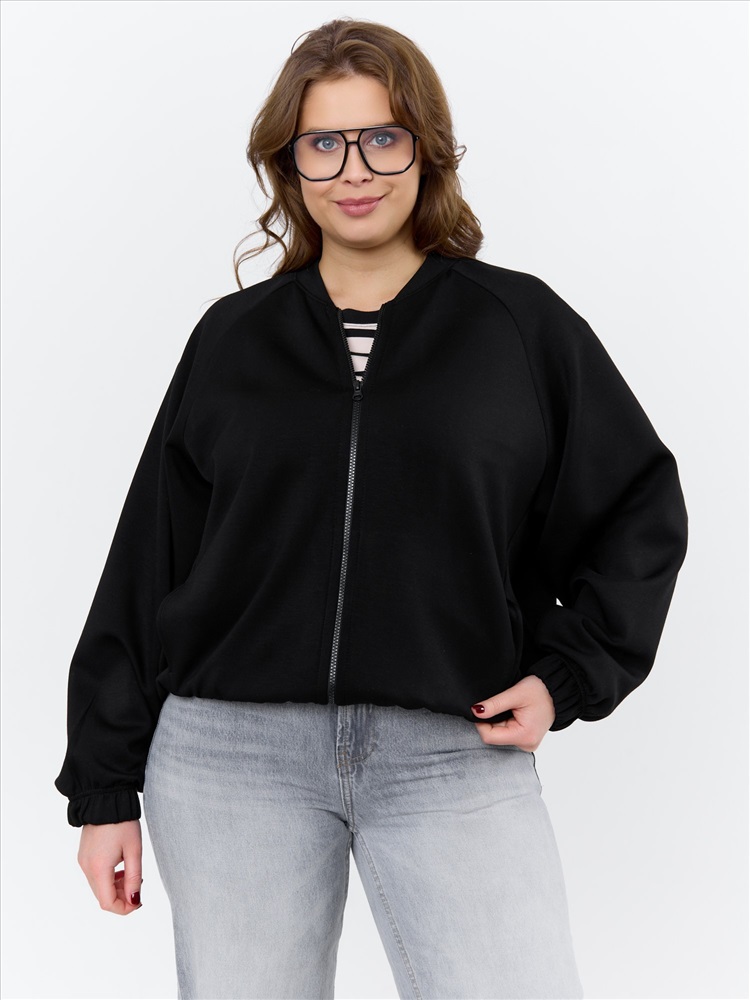 Куртка – бомбер женская из трикотажного гладкокрашенного полотна «скуба» свободная, с горловиной овальной формы обработанной втачной планкой, длинными рукавами кроя «реглан», обработанными подгибкой с эластичной тесьмой внутри, центральной бортовой застежкой на тесьму «молния». На полочке в рельефных швах выполнены карманы. Низ изделия обработан подгибкой с широкой эластичной тесьмой внутри.
