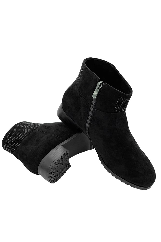 Универсальные ботильоны выполнены из замши. Данная модель идет с замшевой отделкой со стразами. Внутренняя меховая отделка гарантирует тепло и комфорт в течение всего дня. За счет удобной колодки и устойчивого каблука ботильоны очень комфортные и не требуют разнашивания. Подошва из прочного полимера оснащена протектором, что предохраняет обувь от скольжения. Модель застегивается на молнию. Ботильоны будут выигрышно сочетаться с как с юбками, так и с заправленными джинсами и легинсами.