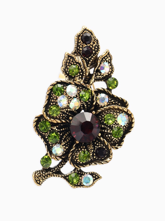 В этом изящном украшении воплощена утончённость природы и загадочность орхидеи. Фиолетово-зелёные оттенки в сочетании с чёрнёным золотом создают глубокий, насыщенный цветовой акцент, который привлекает внимание и подчёркивает индивидуальность каждой женщины.