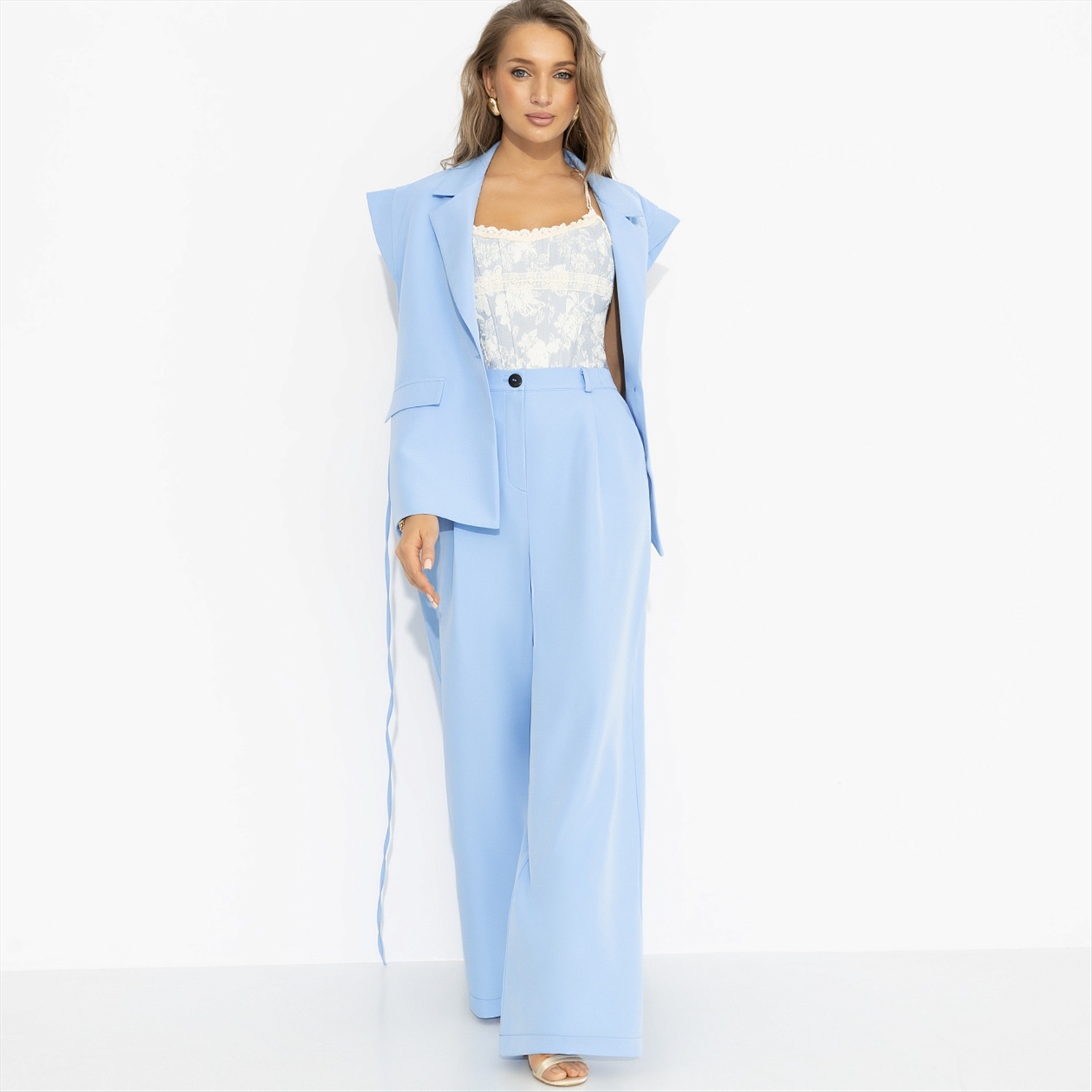 Весна пришла – и ты решила выйти в свет вместе с ней. Эти голубые брюки собирают образ так легко, будто знают прогноз лучше синоптиков. Высокая посадка подчёркивает талию, широкий крой вытягивает силуэт и эффектно струится при каждом шаге. Ткань держит форму, но не сдерживает ни одного твоего стремления. Изделие с карманами.