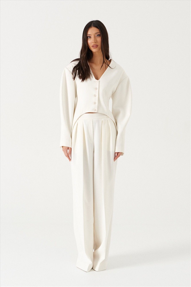 Брюки прямого свободного кроя с декоративными складками, выполнена из костюмной ткани молочного оттенка. Характеристики: прямой свободный крой, пояс частично на резинке(со спинки), в боковых швах косые карманы, по передней части изделия декоративные складки. Длина брюк по боковому шву 114 см.