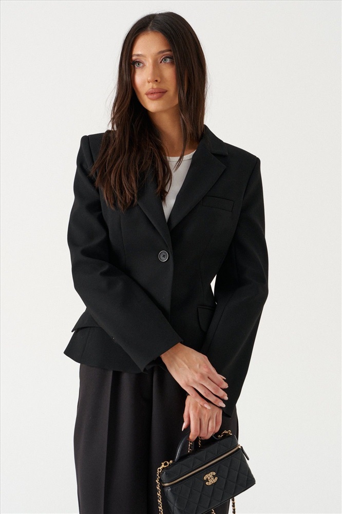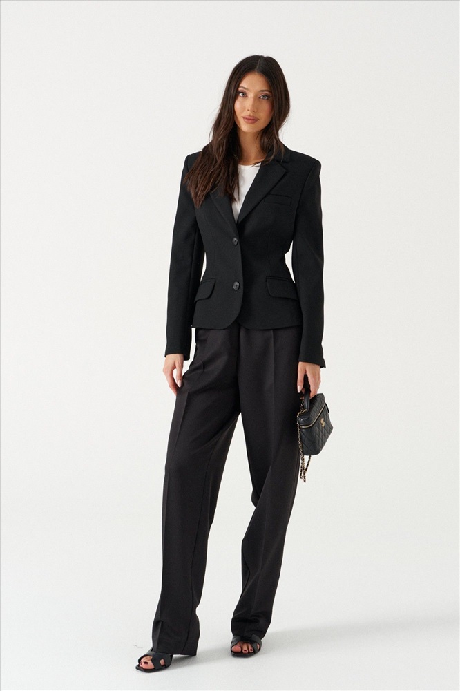 Брюки прямого совбодного кроя, выполнены из костюмной тонкой ткани черного цвета. Характеристика: прямой крой, пояс на резинке, в боковых швах карманы, имитация гульфика, заутюженные стреки спереди и сзади, чуть заужаются к низу. Длина по боковому шву 112см.