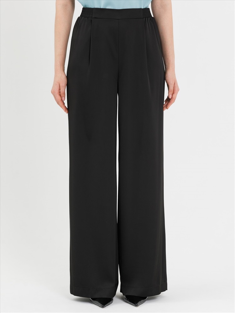 Брюки атласные чёрного цвета от торгового дома Priz. Модель свободного кроя, на притачном поясе. Пояс частично собран на резину. Спереди по талии защипы. Прекрасный выбор для городских модниц., Оттенок цвета может незначительно отличаться от фото., Ожидание отправки (рабочих дней): 7, Длина: в росте 164: в 42 р-ре - 112 см, в 54 р-ре - 113 см., Размер модели: 44., Рост модели: 164 см., Состав:, Вискоза 50%, Полиэстер 48%, Эластан 2%, Тип ткани:, Атлас